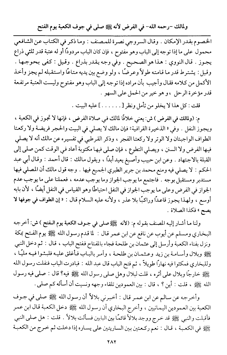 ولنا ما أشار إليه المصنف بقوله م: (لأنه - صَلَّى اللَّهُ عَلَيْهِ وَسَلَّمَ - صلى في جوف الكعبة يوم الفتح) ش: أخرجه البخاري ومسلم عن أيوب عن نافع عن ابن عمر قال: «لما قدم رسول الله - صَلَّى اللَّهُ عَلَيْهِ وَسَلَّمَ - يوم الفتح بمكة ونزل بفناء الكعبة وأرسل إلى عثمان بن طلحة، فجاء بالمفتاح ففتح الباب، قال: ثم دخل النبي - صَلَّى اللَّهُ عَلَيْهِ وَسَلَّمَ - وبلال، وأسامة بن زيد، وعثمان بن طلحة، وأمر بالباب فأغلق عليه فلبثوا فيه مليا» وللبخاري «فمكثوا فيه نهارا طويلا، ثم فتح الباب قال عبد الله: فبادرت الباب فنفلت رسول الله - صَلَّى اللَّهُ عَلَيْهِ وَسَلَّمَ - خارجا، وبلال على أثره، قلت لبلال: وهل صلى رسول الله - صَلَّى اللَّهُ عَلَيْهِ وَسَلَّمَ - فيه؟ قال: صلى فيه رسول الله - صَلَّى اللَّهُ عَلَيْهِ وَسَلَّمَ -، قلت: أين؟ قال: بين العمودين تلقاء وجهه، ونسيت أن أسأله كم صلى» .