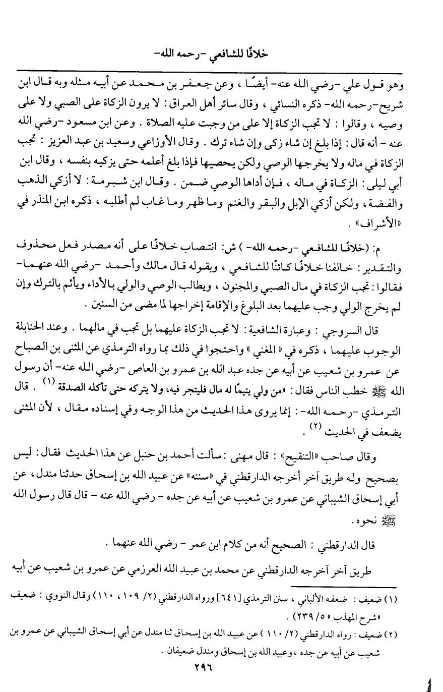 قال السروجي: وعبارة الشافعية: لا تجب الزكاة عليهما بل تجب في مالهما. وعند الحنابلة الوجوب عليهما، ذكره في" المغني " واحتجوا في ذلك بما رواه الترمذي عن المثنى بن الصباح عن عمرو بن شعيب عن أبيه عن جده عبد الله بن عمرو بن العاص - رَضِيَ اللَّهُ عَنْهُ - أن رسول الله - صَلَّى اللَّهُ عَلَيْهِ وَسَلَّمَ - خطب الناس فقال: «من ولي يتيما له مال فليتجر فيه، ولا يتركه حتى تأكله الصدقة» . قال الترمذي - رَحِمَهُ اللَّهُ -: إنما يروى هذا الحديث من هذا الوجه وفي إسناده مقال؛ لأن المثنى يضعف في الحديث.
