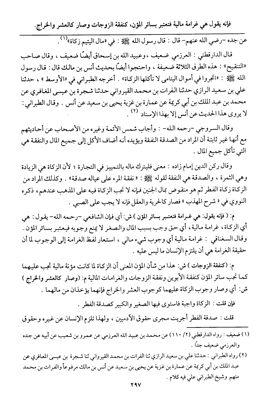 وقال ركن الدين إمام زاده: معني فليترك ماله بالتمييز في التجارة؛ لأن الزكاة هي الزيادة وهي الثمرة، والصدقة هي النفقة؛ لقوله - صَلَّى اللَّهُ عَلَيْهِ وَسَلَّمَ -: «نفقة المرء على عياله صدقة» . وكذلك المراد من الزكاة زكاة الفطر ثم هو منقوض بمال الجنين فإنه لا تجب الزكاة فيه على المذهب عندهم، ذكره النووي في " شرح المهذب " فصار كالحرية والعقل فإنه لا يجب على الصبي.