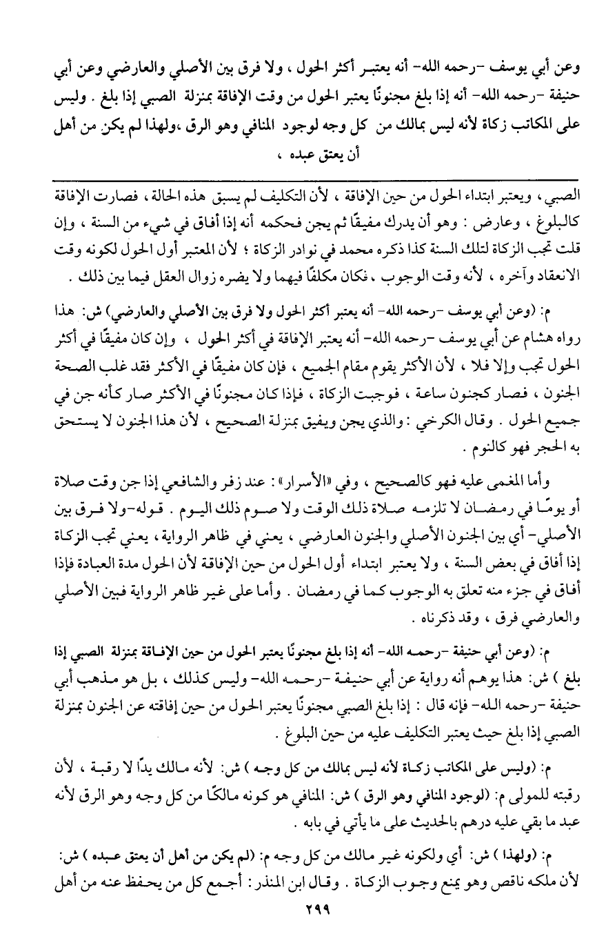 - م: (وعن أبي يوسف - رَحِمَهُ اللَّهُ - أنه يعتبر أكثر الحول ولا فرق بين الأصلي والعارضي) ش: هذا رواه هشام عن أبي يوسف - رَحِمَهُ اللَّهُ - أنه يعتبر الإفاقة في أكثر الحول، وإن كان مفيقا في أكثر الحول تجب وإلا فلا؛ لأن الأكثر يقوم مقام الجميع، فإن كان مفيقا في الأكثر فقد غلب الصحة الجنون، فصار كجنون ساعة، فوجبت الزكاة، فإذا كان مجنونا في الأكثر صار كأنه جن في جميع الحول. وقال الكرخي: والذي يجن ويفيق بمنزلة الصحيح؛ لأن هذا الجنون لا يستحق به الحجر فهو كالنوم.