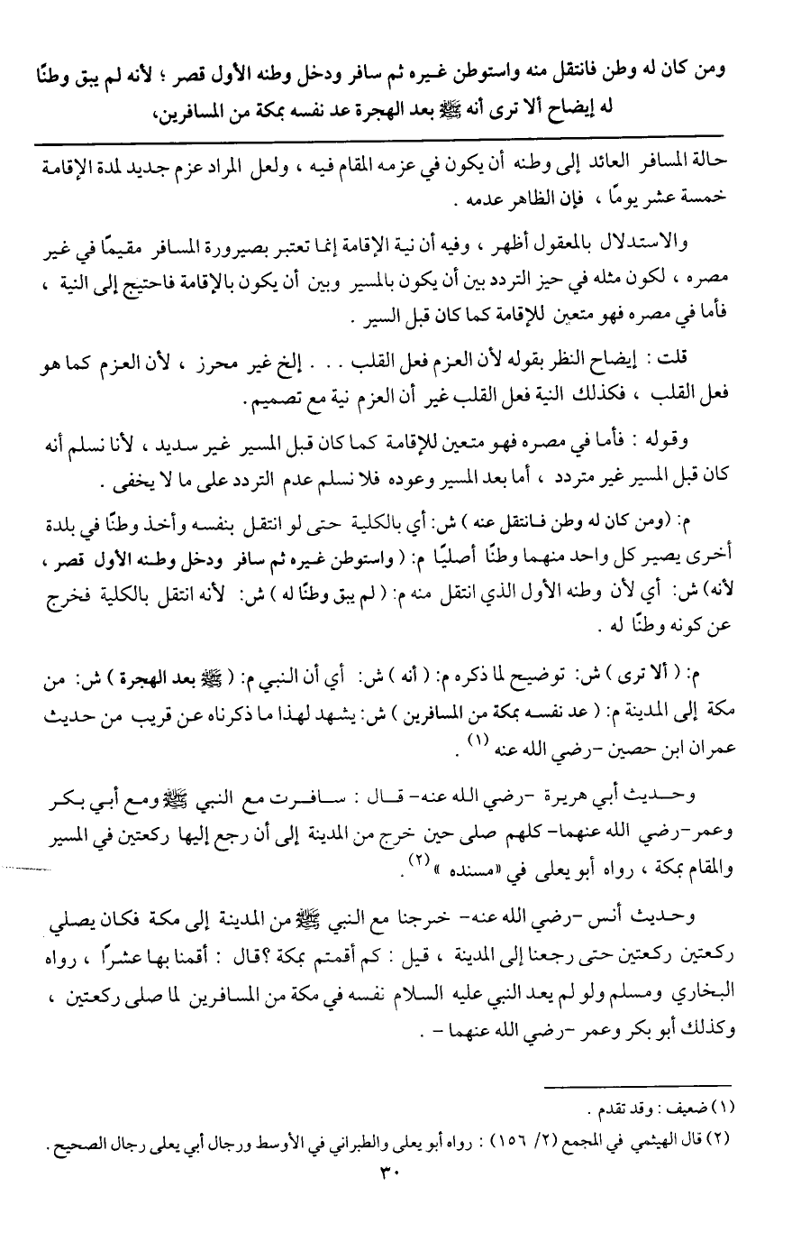 وحديث «أنس - رَضِيَ اللَّهُ عَنْهُ - خرجنا مع النبي - صَلَّى اللَّهُ عَلَيْهِ وَسَلَّمَ - من المدينة إلى مكة فكان يصلي ركعتين ركعتين حتى رجعنا إلى المدينة، قيل: كم أقمتم بمكة؟ قال: أقمنا بها عشرا» رواه البخاري ومسلم ولو لم يعد النبي - عَلَيْهِ السَّلَامُ - نفسه في مكة من المسافرين لما صلى ركعتين، وكذلك أبو بكر وعمر - رَضِيَ اللَّهُ عَنْهُمَا -.