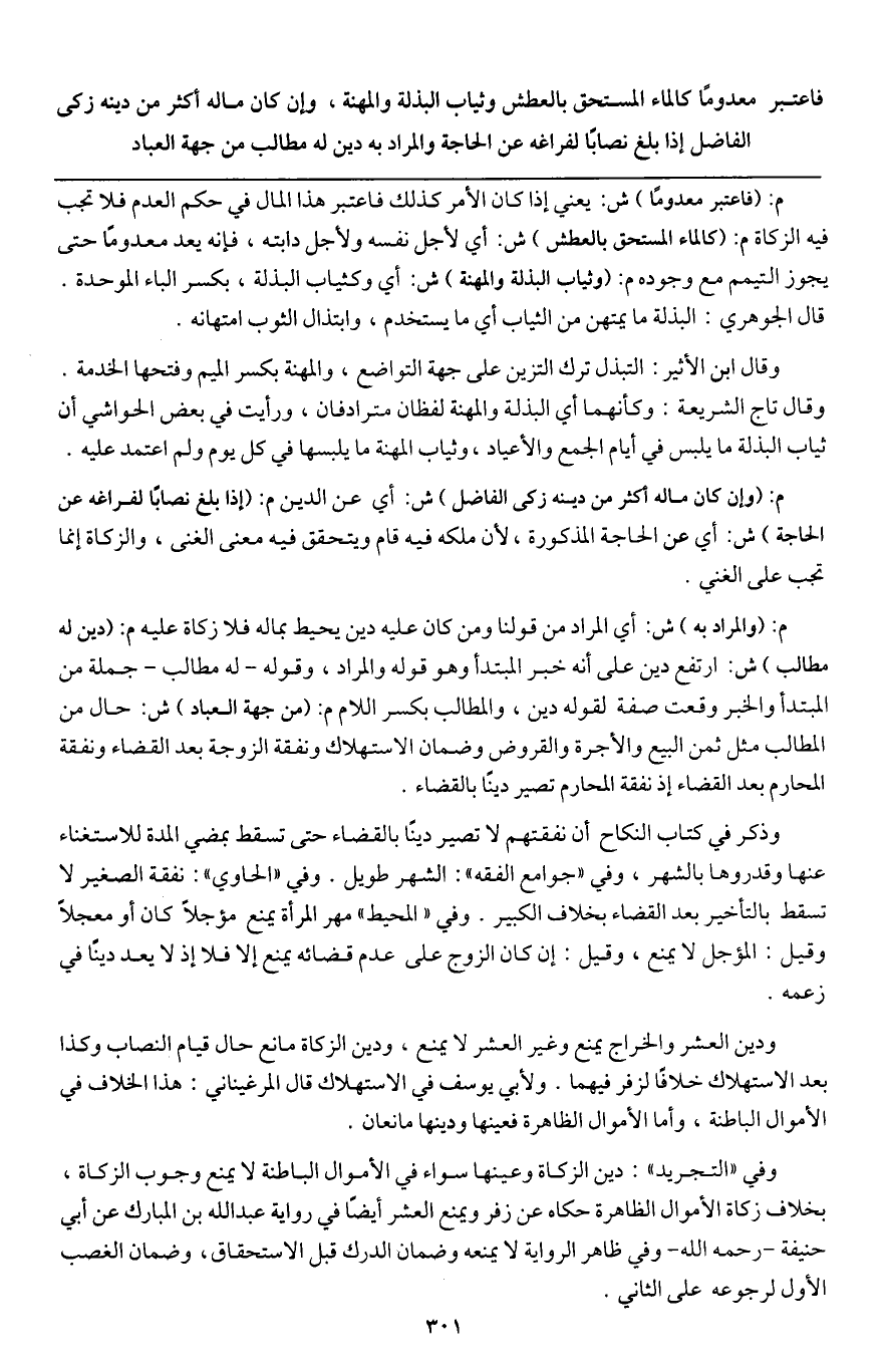 ـــــــــــــــــــــــــــــQم: (فاعتبر معدوما) ش: يعني إذا كان الأمر كذلك فاعتبر هذا المال في حكم العدم فلا تجب فيه الزكاة م: (كالماء المستحق بالعطش) ش: أي لأجل نفسه ولأجل دابته، فإنه يعد معدوما حتى يجوز التيمم مع وجوده م: (وثياب البذلة والمهنة) ش: أي وكثياب البذلة، بكسر الباء الموحدة. قال الجوهري: البذلة ما يمتهن من الثياب أي ما يستخدم، وابتذال الثوب امتهانه.