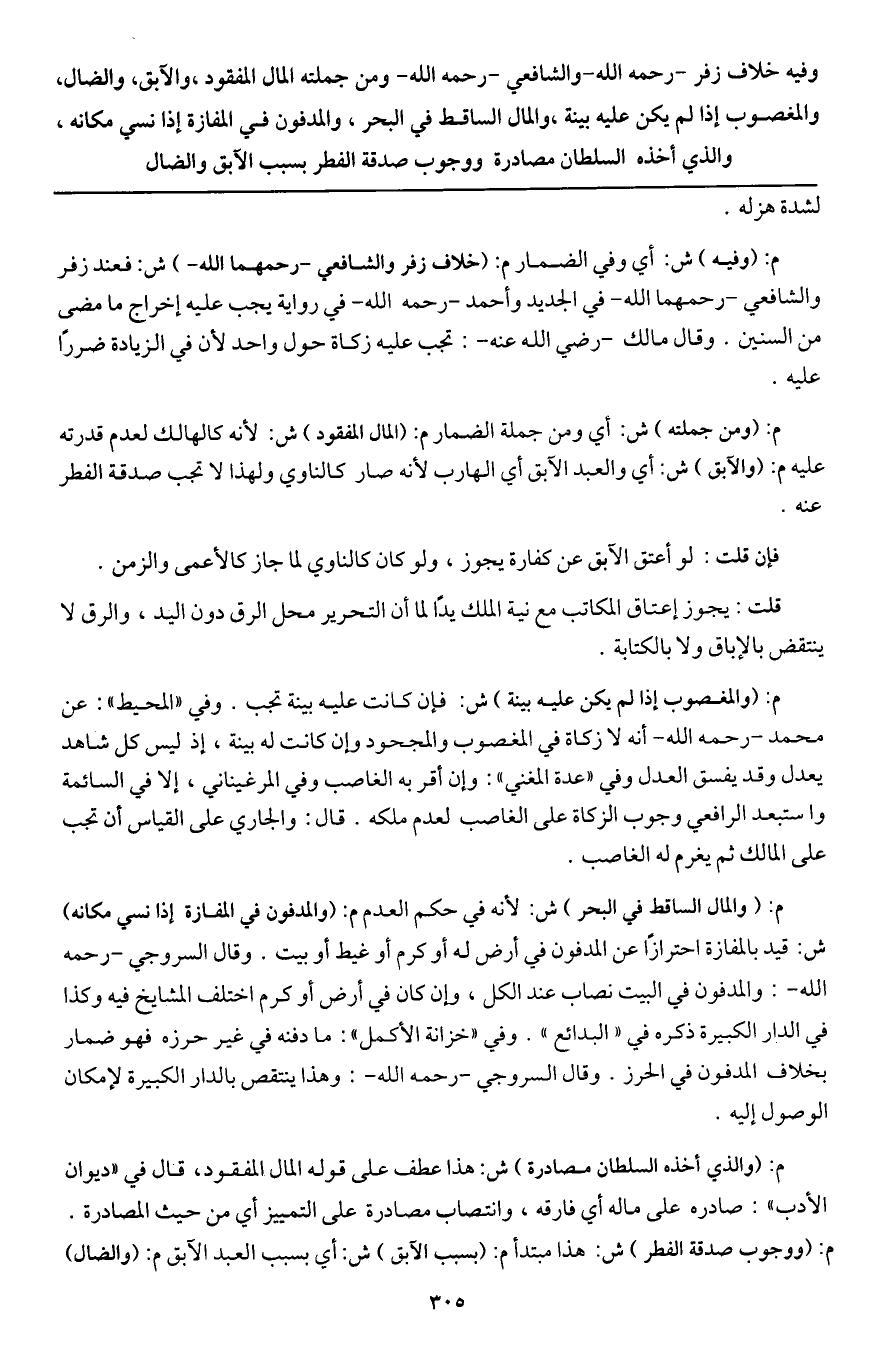م: (والذي أخذه السلطان مصادرة) ش: هذا عطف على قوله المال المفقود، قال في " ديوان الأدب ": صادره على ماله أي فارقه، وانتصاب مصادرة على التمييز أي من حيث المصادرة. م: (ووجوب صدقة الفطر) ش: هذا مبتدأ م: (بسبب الآبق) ش: أي بسبب العبد الآبق م: (والضال)