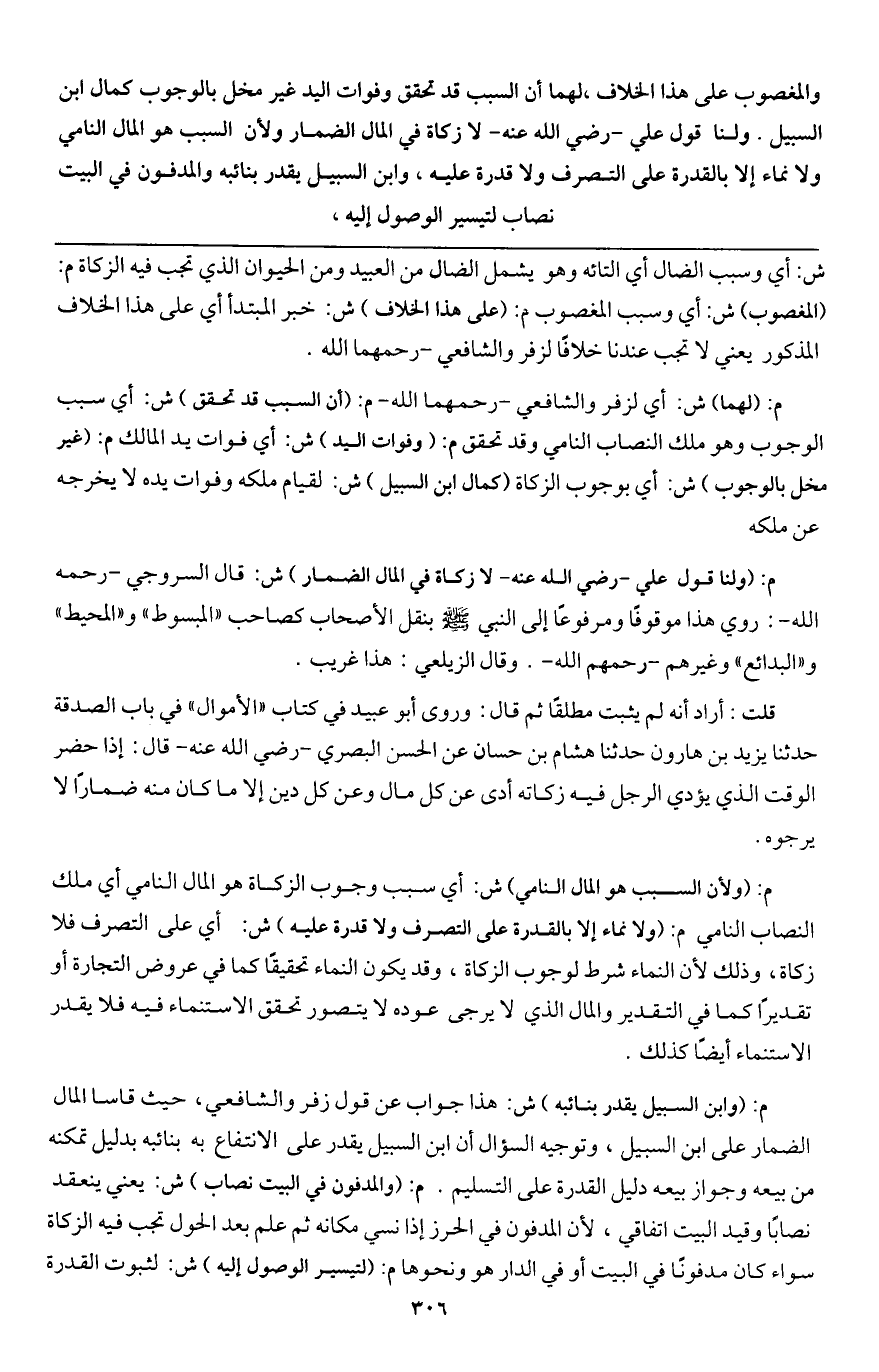 ـــــــــــــــــــــــــــــQش: أي وسبب الضال، أي التائه وهو يشمل الضال من العبيد ومن الحيوان الذي تجب فيه الزكاة م (المغصوب) ش: أي وسبب المغصوب م: (على هذا الخلاف) ش: خبر المبتدأ أي على هذا الخلاف المذكور، يعني لا تجب عندنا خلافا لزفر والشافعي -رحمهما الله- م: (لهما) ش: أي لزفر والشافعي -رحمهما الله- م: (أن السبب قد تحقق) ش: أي سبب الوجوب وهو ملك النصاب النامي، وقد تحقق م: (وفوات اليد) ش: أي فوات يد المالك م: (غير مخل بالوجوب) ش: أي بوجوب الزكاة (كمال ابن السبيل) ش: لقيام ملكه وفوات يده لا يخرجه عن ملكه.