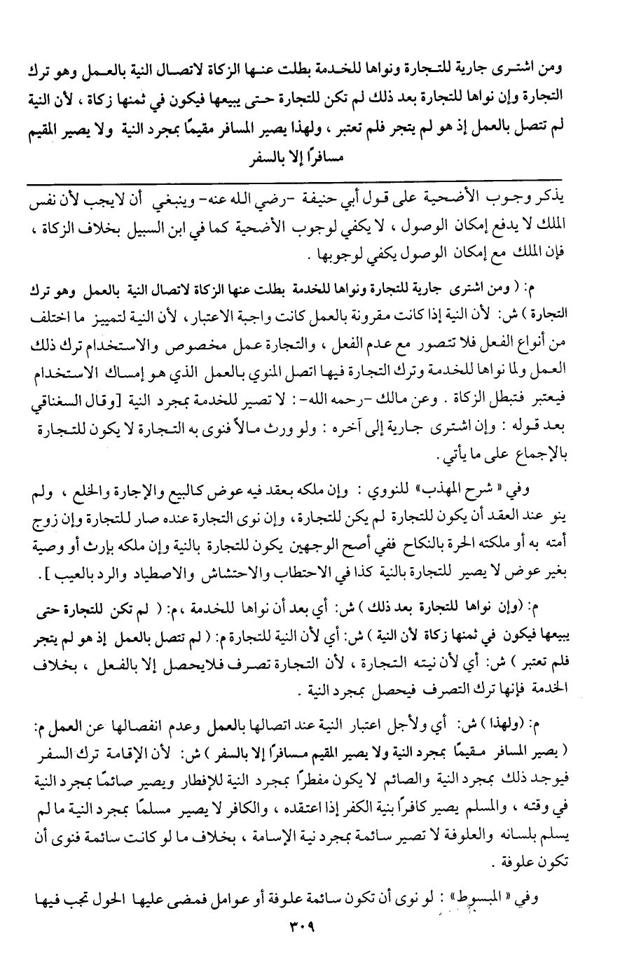 ومن اشترى جارية للتجارة ونواها للخدمة بطلت عنها الزكاة؛ لاتصال النية بالعمل وهو ترك التجارة، وإن نواها للتجارة بعد ذلك لم تكن للتجارة حتى يبيعها؛ فيكون في ثمنها زكاة؛ لأن النية لم تتصل بالعمل إذ هو لم يتجر فلم تعتبر، ولهذا يصير المسافر مقيما بمجرد النية ولا يصير المقيم مسافرا إلا بالسفر