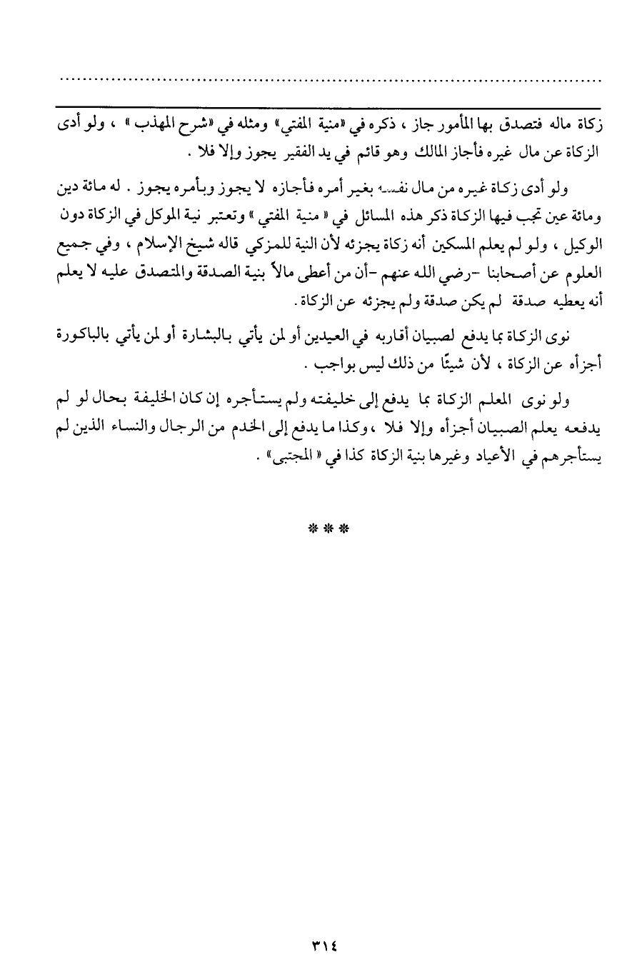 ولو نوى المعلم الزكاة بما يدفع إلى خليفته ولم يستأجره إن كان الخليفة بحال لو لم يدفعه يعلم الصبيان أجزأه وإلا فلا، وكذا ما يدفع إلى الخدم من الرجال والنساء الذين لم يستأجرهم في الأعياد وغيرها بنية الزكاة كذا في " المجتبى ".