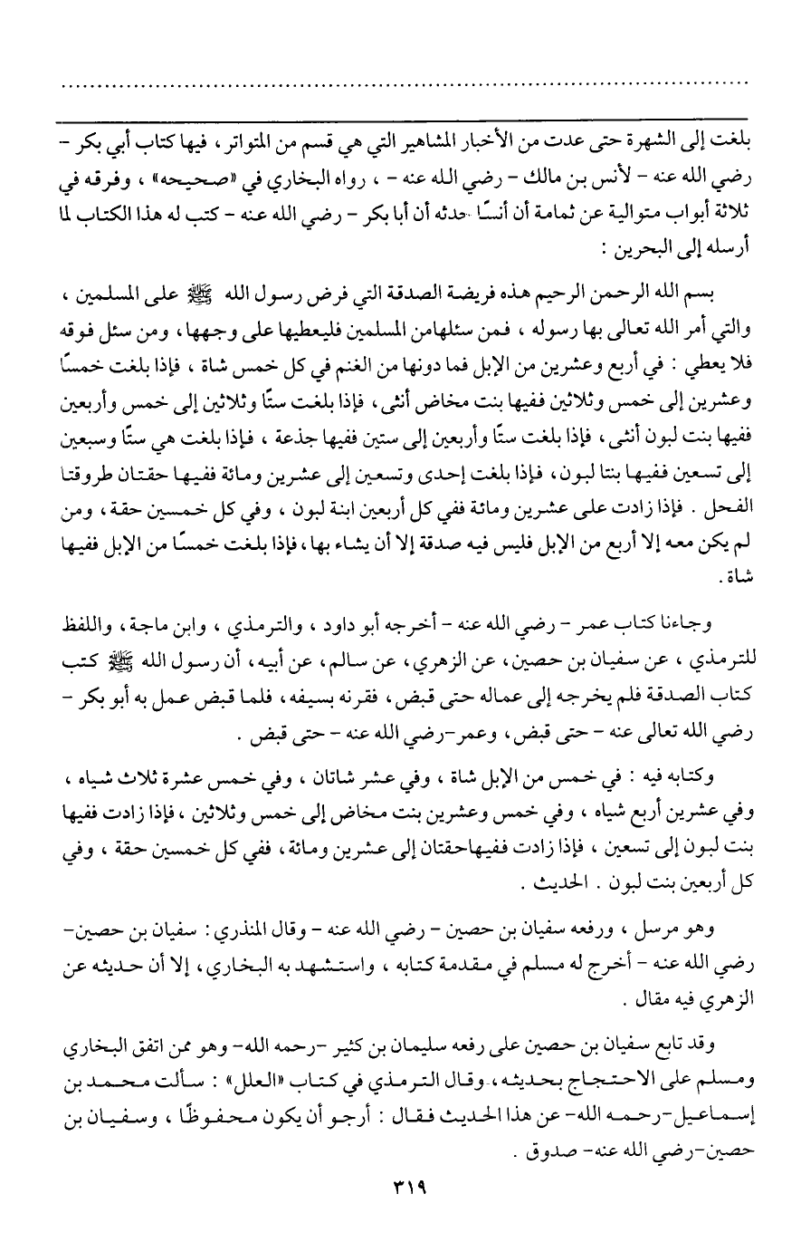 ـــــــــــــــــــــــــــــQبلغت إلى الشهرة حتى عدت من الأخبار المشاهير التي هي قسم من المتواتر، فيها كتاب أبي بكر - رَضِيَ اللَّهُ عَنْهُ - لأنس بن مالك - رَضِيَ اللَّهُ عَنْهُ -، رواه البخاري في "صحيحه "، وفرقه في ثلاثة أبواب متوالية، عن ثمامة أن أنسا حدثه أن أبا بكر - رَضِيَ اللَّهُ عَنْهُ - كتب له هذا الكتاب لما أرسله إلى البحرين: