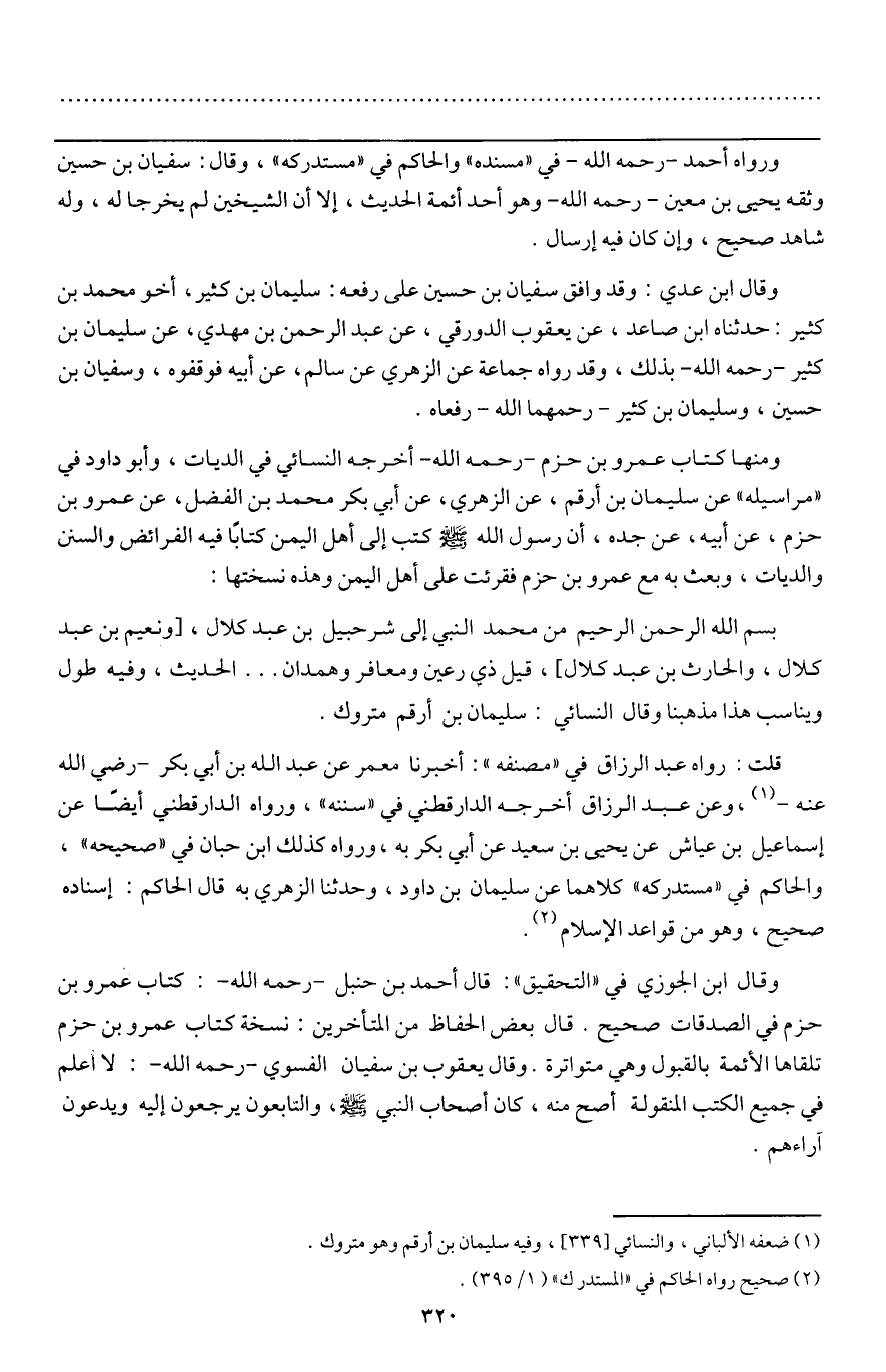 بِسْمِ اللَّهِ الرَّحْمَنِ الرَّحِيمِ من محمد النبي إلى شرحبيل بن عبد كلال، [ونعيم بن عبد كلال، والحارث بن عبد كلال] » ، قيل: ذي رعين ومعافر وهمدان ... الحديث، وفيه طول ويناسب هذا مذهبنا، وقال النسائي: سليمان بن أرقم متروك.