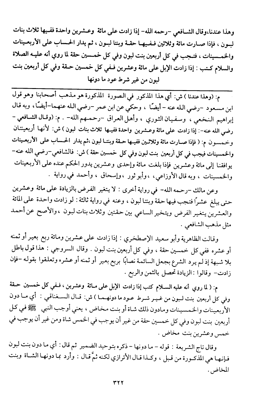 ـــــــــــــــــــــــــــــQم: (وهذا عندنا) ش: أي هذا المذكور في الصورة المذكورة هو مذهب أصحابنا وهو قول ابن مسعود - رَضِيَ اللَّهُ عَنْهُ - أيضا، وحكي عن ابن عمر - رَضِيَ اللَّهُ عَنْهُمَا - أيضا، وبه قال إبراهيم النخعي، وسفيان الثوري، وأهل العراق - رَحِمَهُمُ اللَّهُ -. م: (وقال الشافعي - رَضِيَ اللَّهُ عَنْهُ -: إذا زادت على مائة وعشرين واحدة ففيها ثلاث بنات لبون) ش: لأنها أربعينتان وخمسون، م: (فإذا صارت مائة وثلاثين ففيها حقة وبنتا لبون، ثم يدار الحساب على الأربعينات والخمسينات فيجب في كل أربعين بنت لبون وفي كل خمسين حقة) ش: فالشافعي - رَضِيَ اللَّهُ عَنْهُ - يوافقنا إلى مائة وعشرين، فإذا بلغت مائة وإحدى وعشرين يدور الحكم عنده على الأربعينات والخمسينات، وبه قال الأوزاعي، وأبو ثور، وإسحاق، وأحمد في رواية.