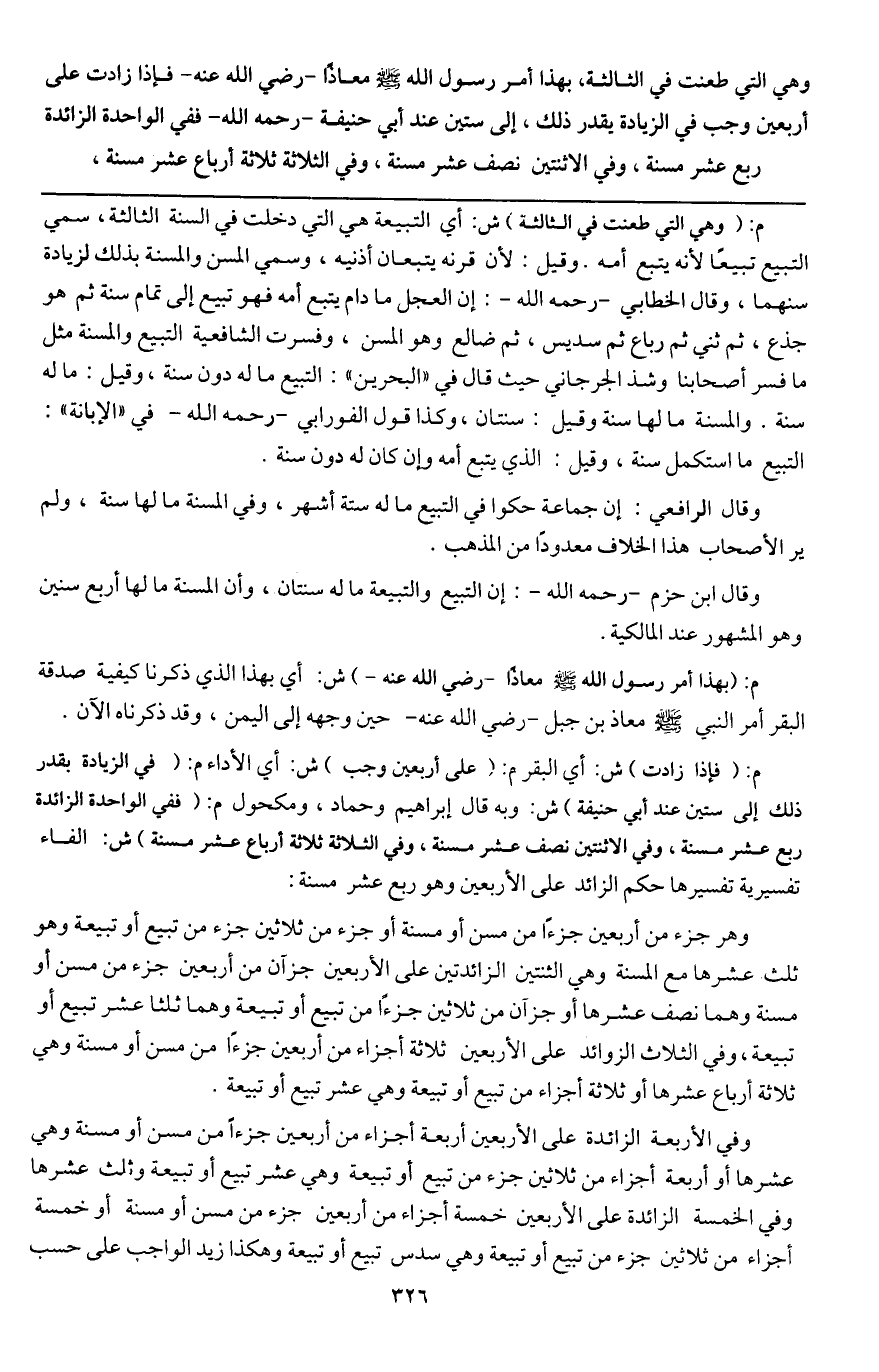 وهو جزء من أربعين جزءا من مسن أو مسنة أو جزء من ثلاثين جزءا من تبيع أو تبيعة، وهو ثلث عشرها مع المسنة، وهو الثنتين الزائدتين على الأربعين جزآن من أربعين جزءا من مسن أو مسنة، وهما نصف عشرها، أو جزآن من ثلاثين جزءا من تبيع أو تبيعة، وهما ثلثا عشر تبيع أو تبيعة، وفي الثلاث الزوائد على الأربعين ثلاثة أجزاء من أربعين جزءا من مسن أو مسنة، وهي ثلاثة أرباع عشرها أو ثلاثة أجزاء من تبيع أو تبيعة، وهي عشر تبيع أو تبيعة.