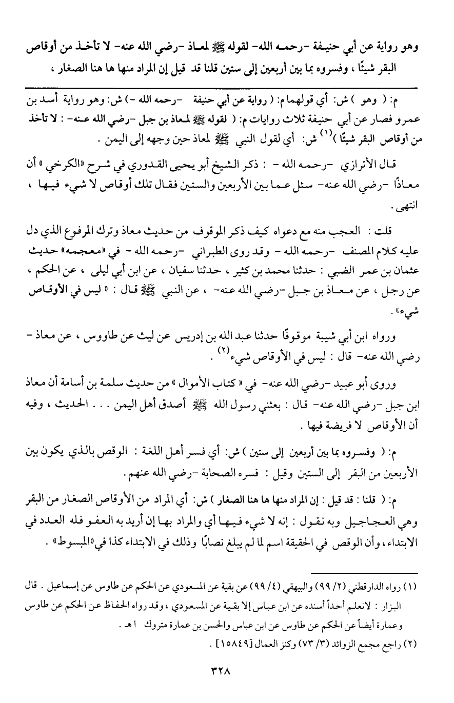 ورواه ابن شيبة موقوفا حدثنا عبد الله بن إدريس عن ليث، عن طاوس، عن معاذ - رَضِيَ اللَّهُ عَنْهُ - قال: «ليس في الأوقاص شيء» .