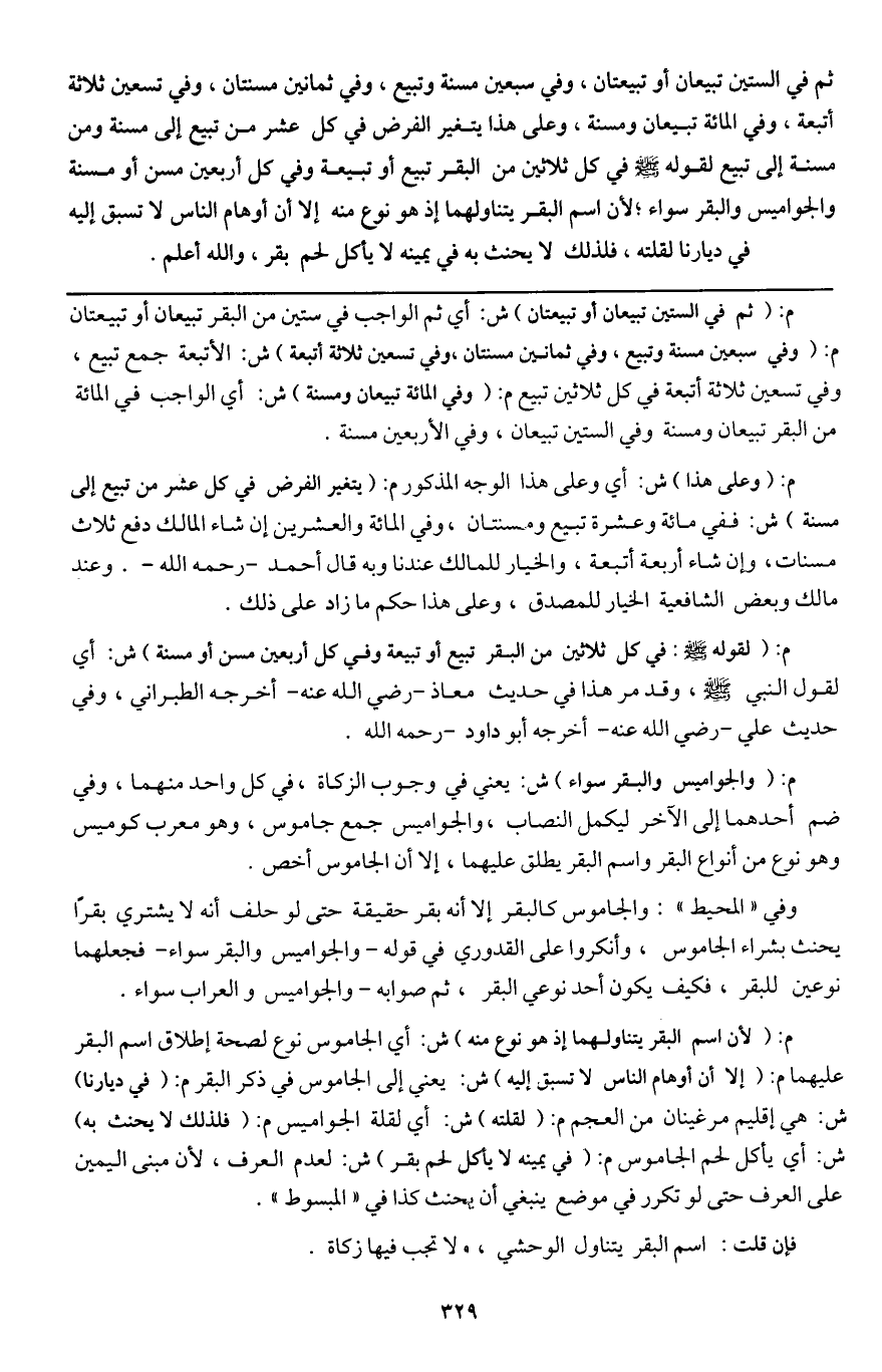 وفي " المحيط ": والجاموس كالبقر إلا أنه بقر حقيقة حتى لو حلف أنه لا يشتري بقرا يحنث بشراء الجاموس، وأنكروا على القدوري في قوله- والجواميس والبقر سواء- فجعلهما نوعين للبقر، فكيف يكون أحد نوعي البقر، ثم صوابه- والجواميس والعراب سواء.