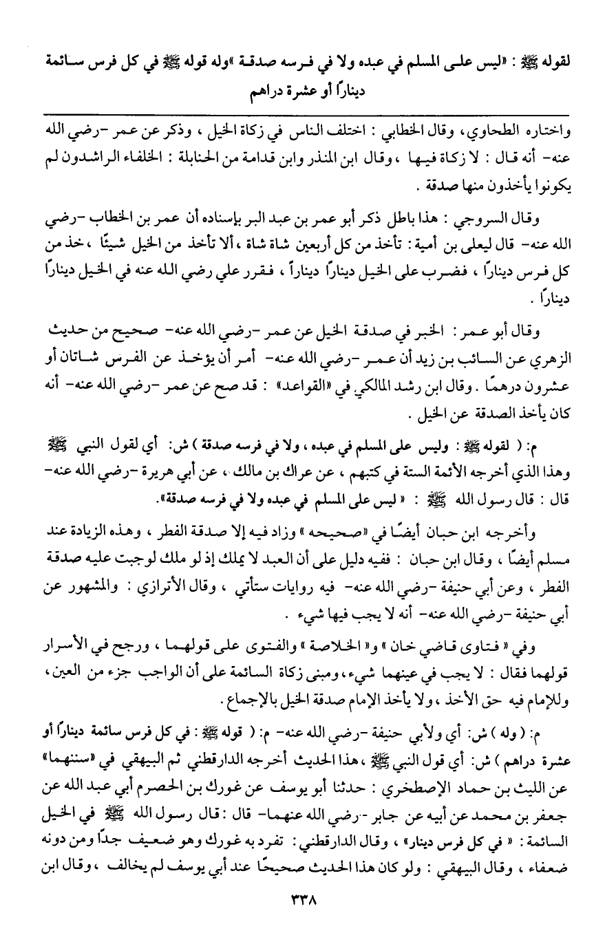 وقال السروجي: هذا باطل ذكر أبو عمر بن عبد البر بإسناده أن عمر بن الخطاب - رَضِيَ اللَّهُ عَنْهُ - قال ليعلى بن أمية: تأخذ من كل أربعين شاة شاة، ألا تأخذ من الخيل شيئا، خذ من كل فرس دينارا، فضرب على الخيل دينارا دينارا، فقرر علي - رَضِيَ اللَّهُ عَنْهُ - في الخيل دينار دينارا.