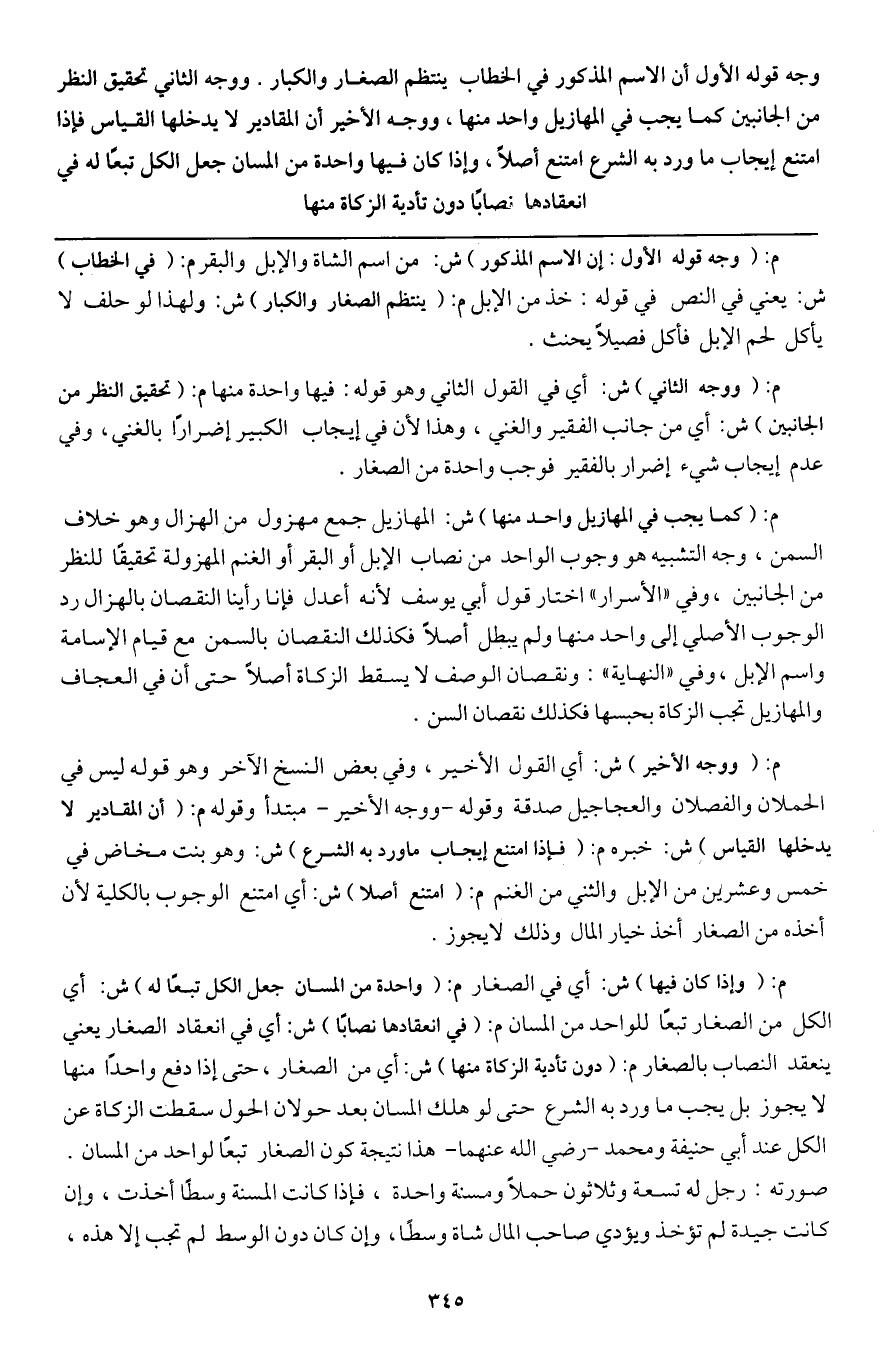 ـــــــــــــــــــــــــــــQم: (وجه قوله الأول: إن الاسم المذكور) ش: من اسم الشاة والإبل والبقر م: (في الخطاب) ش: يعني في النص في قوله: خذ من الإبل م: (ينتظم الصغار والكبار) ش: ولهذا لو حلف لا يأكل لحم الإبل فأكل فصيلا يحنث.