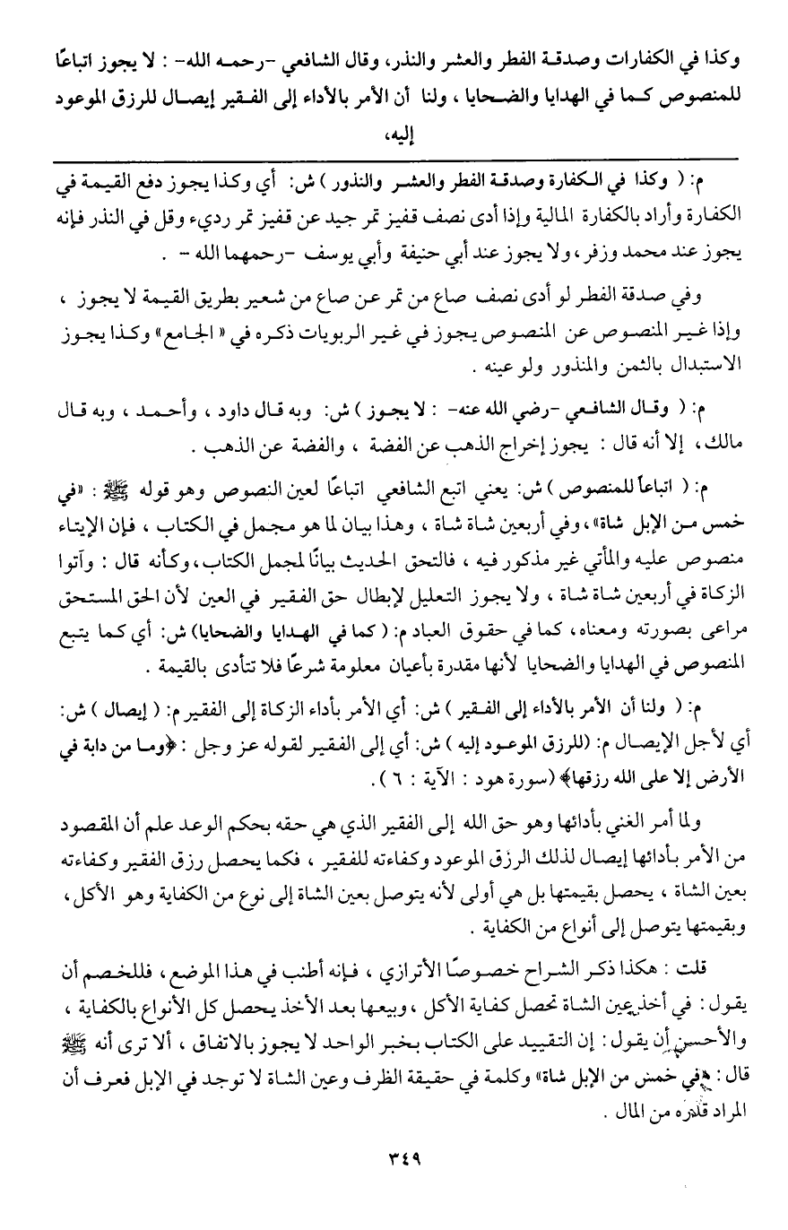 وكذا في الكفارات، وصدقة الفطر، والعشر، والنذر، وقال الشافعي - رَحِمَهُ اللَّهُ -: لا يجوز اتباعا للمنصوص كما في الهدايا والضحايا، ولنا أن الأمر بالأداء إلى الفقير إيصال للرزق الموعود إليه