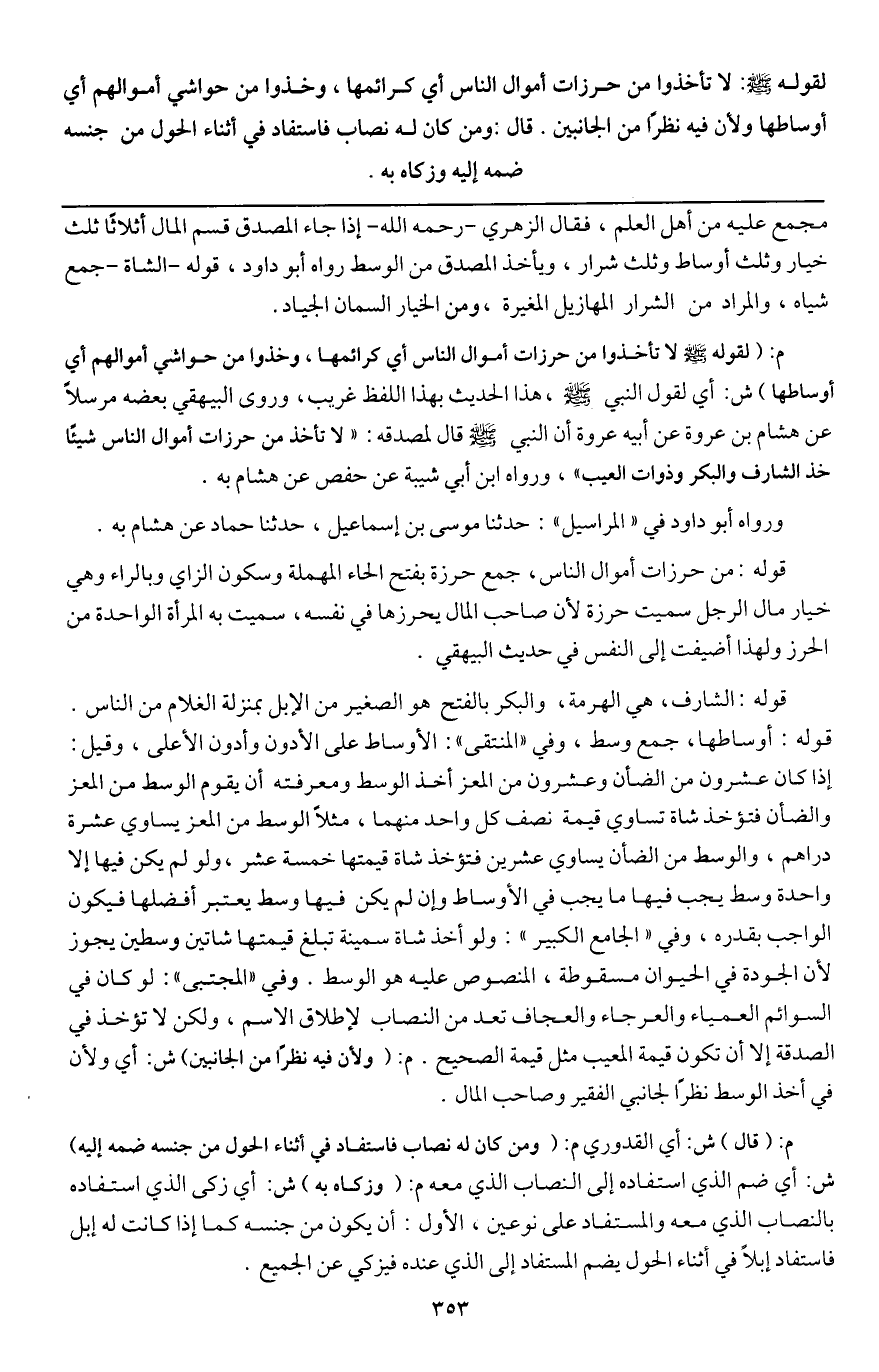 ـــــــــــــــــــــــــــــQمجمع عليه من أهل العلم، فقال الزهري - رَحِمَهُ اللَّهُ - إذا جاء المصدق قسم المال أثلاثا: ثلث خيار، وثلث أوساط، وثلث شرار، ويأخذ المصدق من الوسط رواه أبو داود، قوله -الشاة- جمع شياه، والمراد من الشرار المهازيل المغيرة، ومن الخيار السمان الجياد.