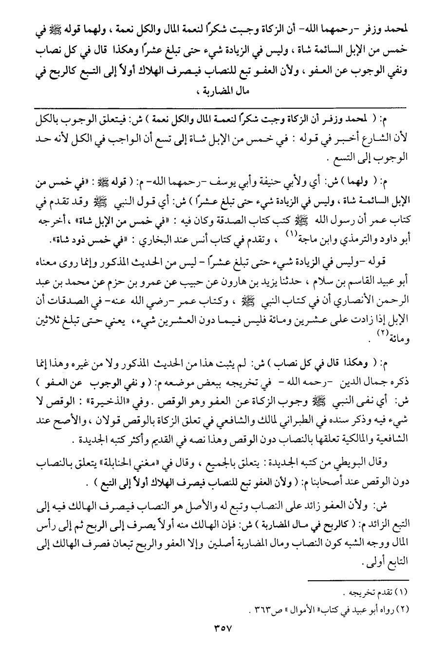 قوله- وليس في الزيادة شيء حتى تبلع عشرا- ليس من الحديث المذكور، وإنما روى معناه أبو عبيد القاسم بن سلام، حدثنا يزيد بن هارون، عن حبيب، عن عمرو بن حزم، عن محمد بن عبد الرحمن الأنصاري أن في كتاب النبي - صَلَّى اللَّهُ عَلَيْهِ وَسَلَّمَ -، وكتاب عمر - رَضِيَ اللَّهُ عَنْهُ - في الصدقات أن الإبل إذا زادت على عشرين ومائة فليس فيما دون العشرين شيء، يعني حتى تبلغ ثلاثين ومائة.