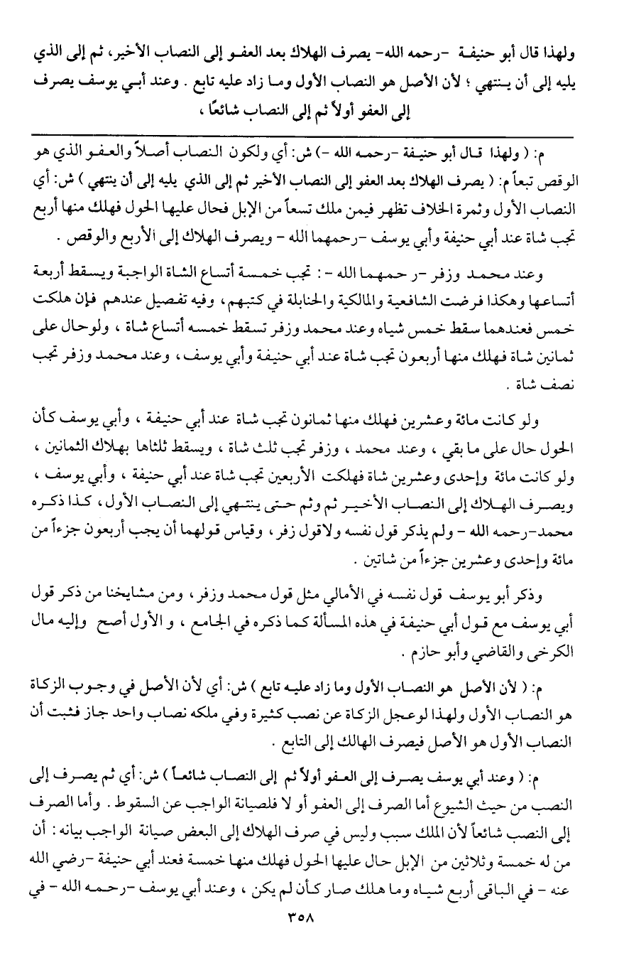 ولهذا قال أبو حنيفة - رَحِمَهُ اللَّهُ - يصرف الهلاك بعد العفو إلى النصاب الأخير، ثم إلى الذي يليه إلى أن ينتهي؛ لأن الأصل هو النصاب الأول، وما زاد عليه تابع. وعند أبي يوسف يصرف إلى العفو أولا، ثم إلى النصاب شائعا