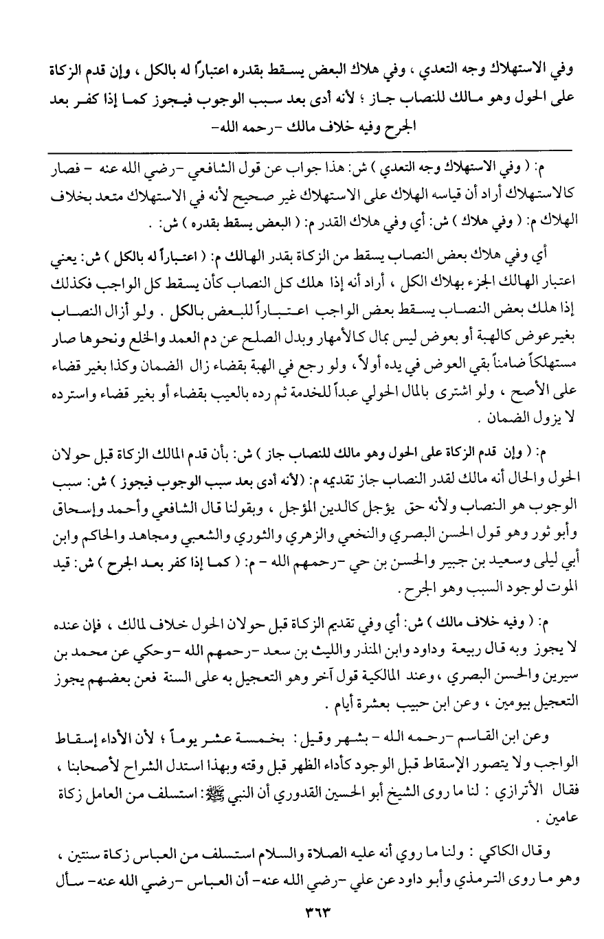 وعن ابن القاسم - رَحِمَهُ اللَّهُ - بشهر، وقيل: بخمسة عشر يوما؛ لأن الأداء إسقاط الواجب ولا يتصور الإسقاط قبل الوجود، كأداء الظهر قبل وقته، وبهذا استدل الشراح لأصحابنا، فقال الأترازي: لنا ما روى الشيخ أبو الحسين القدوري أن النبي - صَلَّى اللَّهُ عَلَيْهِ وَسَلَّمَ -: استسلف من العامل زكاة عامين.
