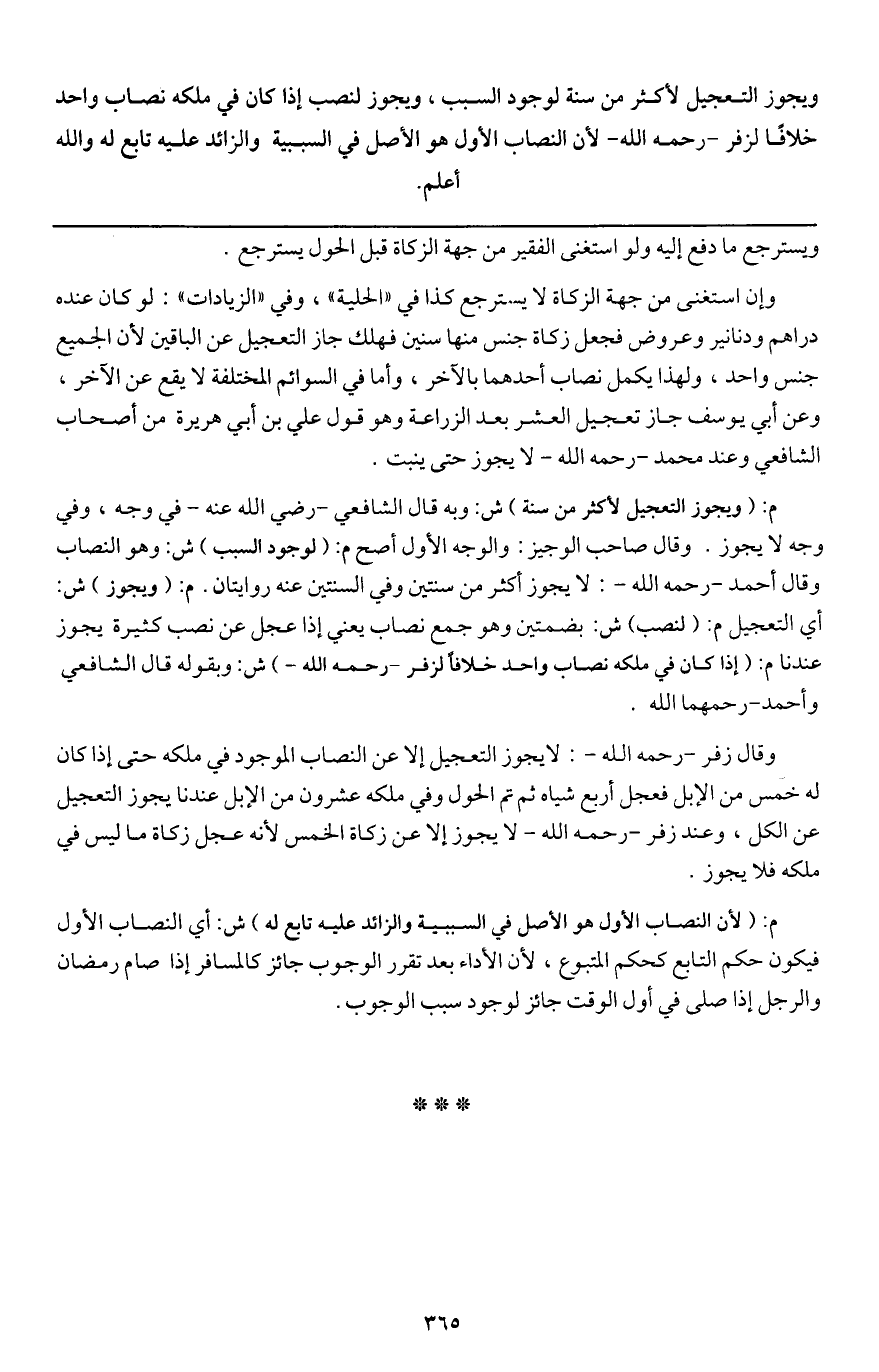 ويجوز التعجيل لأكثر من سنة لوجود السبب، ويجوز لنصب إذا كان في ملكه نصاب واحد، خلافا لزفر - رَحِمَهُ اللَّهُ - لأن النصاب الأول هو الأصل في السببية، والزائد عليه تابع له والله أعلم.