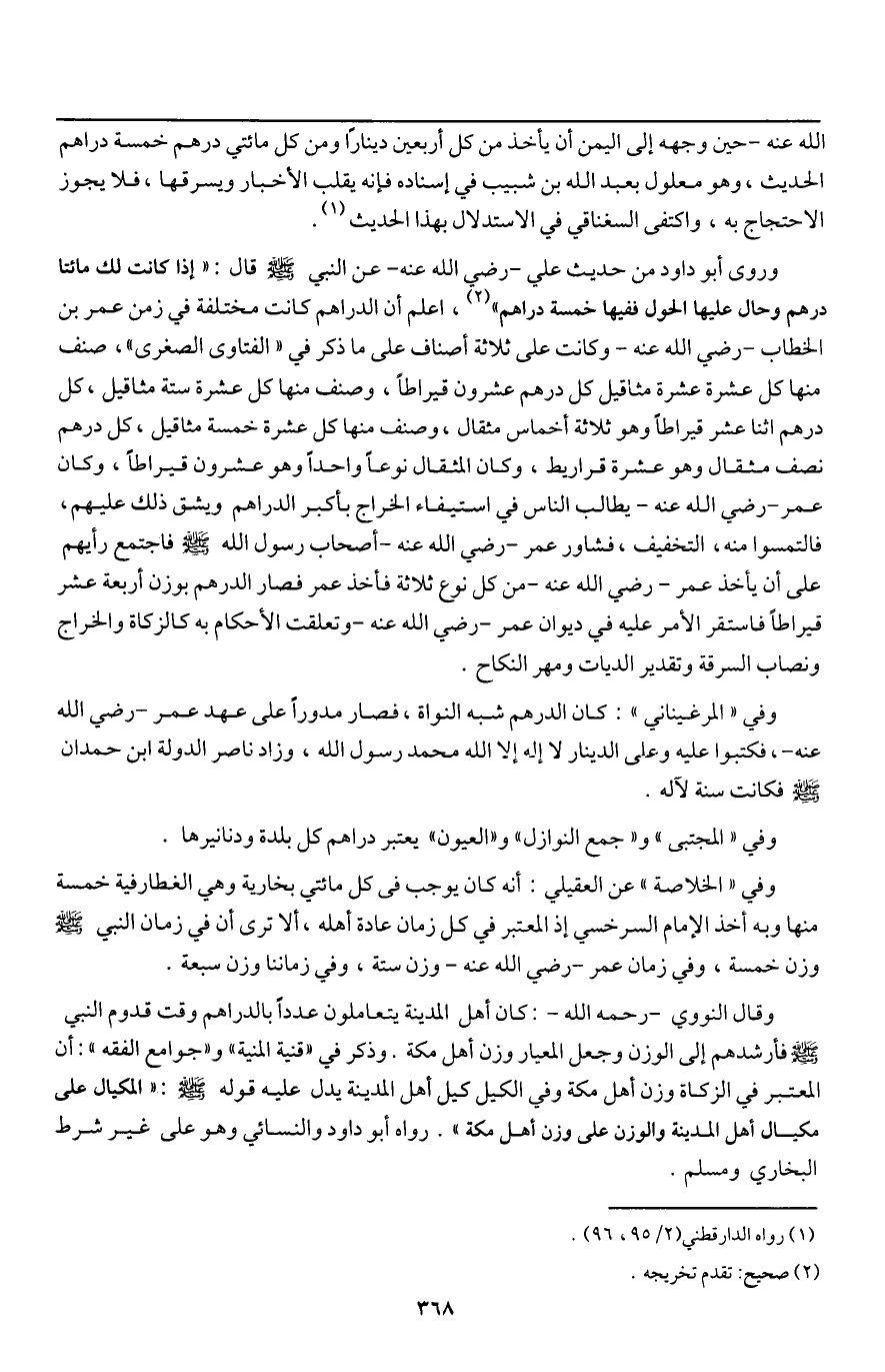 وروى أبو داود من حديث علي - رَضِيَ اللَّهُ عَنْهُ - عن النبي - صَلَّى اللَّهُ عَلَيْهِ وَسَلَّمَ - قال: «إذا كانت لك مائتا درهم وحال عليها الحول ففيها خمسة دراهم» ، اعلم أن الدراهم كانت مختلفة في زمن عمر بن الخطاب - رَضِيَ اللَّهُ عَنْهُ - وكانت على ثلاثة أصناف على ما ذكر في " الفتاوى الصغرى "، صنف منها كل عشرة عشرة مثاقيل، كل درهم عشرون قيراطا، وصنف منها كل عشرة ستة مثاقيل، كل درهم اثنا عشرة قيراطا، وهو ثلاثة أخماس مثقال، وصنف منها كل عشرة خمسة مثاقيل كل درهم نصف مثقال، وهو عشرة قراريط، وكان المثقال نوعا واحدا وهو عشرون قيراطا، وكان عمر - رَضِيَ اللَّهُ عَنْهُ - يطالب الناس في استيفاء الخراج بأكبر الدراهم ويشق ذلك عليهم، فالتمسوا منه التخفيف، فشاور عمر - رَضِيَ اللَّهُ عَنْهُ - أصحاب رسول الله - صَلَّى اللَّهُ عَلَيْهِ وَسَلَّمَ - فاجتمع رأيهم على أن يأخذ عمر - رَضِيَ اللَّهُ عَنْهُ - من كل نوع ثلاثة، فأخذ عمر، فصار الدرهم بوزن أربعة عشر قيراطا، فاستقر الأمر عليه في ديوان عمر - رَضِيَ اللَّهُ عَنْهُ - وتعلقت الأحكام به كالزكاة والخراج ونصاب السرقة وتقدير الديات ومهر النكاح.