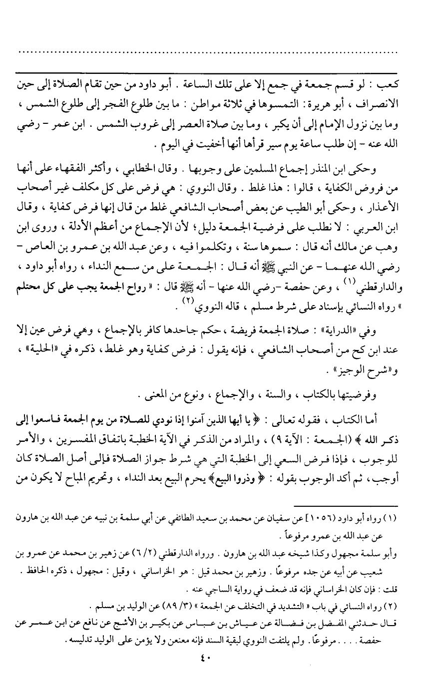 وحكى ابن المنذر إجماع المسلمين على وجوبها. وقال الخطابي، وأكثر الفقهاء على أنها من فروض الكافية، قالوا: هذا غلط، وقال النووي: هي فرض على كل مكلف غير أصحاب الأعذار، وحكى أبو الطيب عن بعض أصحاب الشافعي غلط من قال إنها فرض كفاية، وقال ابن العربي: لا نطلب على فرضية الجمعة دليلا؛ لأن الإجماع من أعظم الأدلة، وروى ابن وهب عن مالك أنه قال: سموها سنة، وتكلموا فيه، وعن عبد الله بن عمرو بن العاص - رَضِيَ اللَّهُ عَنْهُمَا - عن النبي - صَلَّى اللَّهُ عَلَيْهِ وَسَلَّمَ - أنه قال: «الجمعة على من سمع النداء» رواه أبو داود، والدارقطني، وعن حفصة - رَضِيَ اللَّهُ عَنْهَا - أنه - صَلَّى اللَّهُ عَلَيْهِ وَسَلَّمَ - قال: «رواح الجمعة يجب على كل محتلم» رواه النسائي بإسناد على شرط مسلم، قاله النووي.