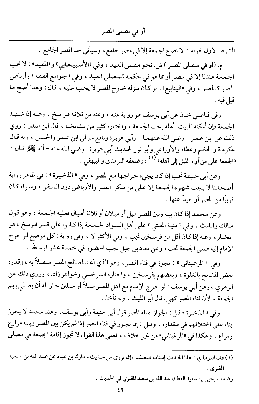 م: (أو في مصلى المصر) ش: نحو مصلى العيد، وفي " الأسبيجابي " و" المفيد ": لا تجب الجمعة عندنا إلا في مصر أو مما هو في حكمه كمصلى العيد، وفي " جوامع الفقه " وأرباض المصر كالمصر، وفي " الينابيع ": لو كان منزله خارج المصر لا يجب عليه، قال: وهذا أصح ما قيل فيه.