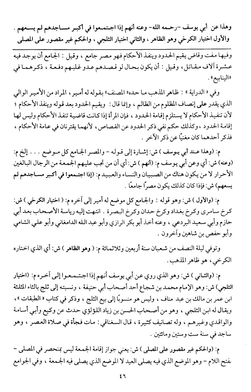 ـــــــــــــــــــــــــــــQوفيها مفت وقاض يقيم الحدود وينفذ الأحكام فهو مصر جامع، وقيل: الجامع أن يوجد فيه عشرة آلاف مقاتل، وقيل: أن يكون بحال لو قصدهم عدو غلبهم دفعه، ذكرهما في " الينابيع ".