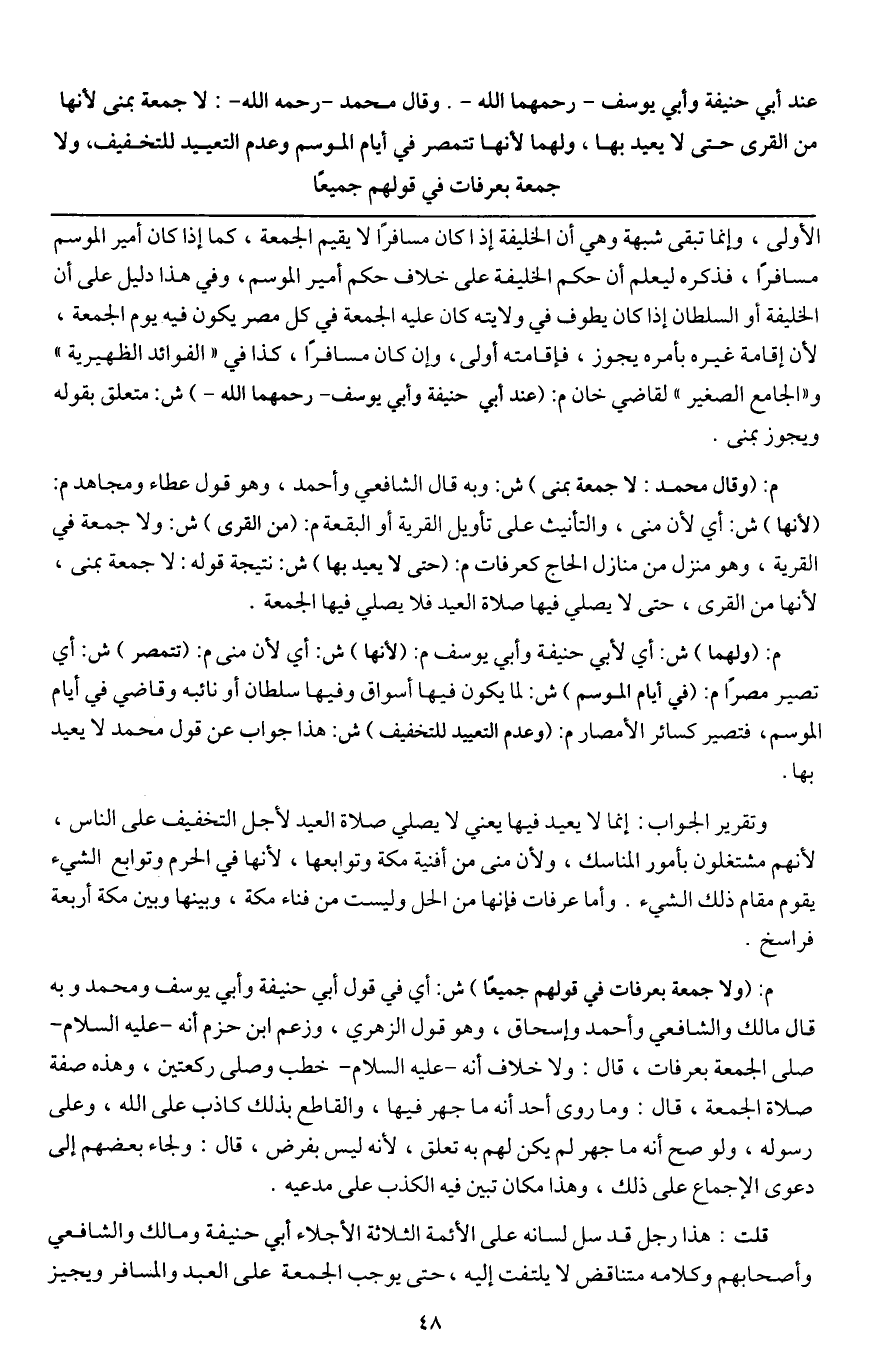 وقال محمد - رَحِمَهُ اللَّهُ -: لا جمعة بمنى لأنها من القرى حتى لا يعيد بها، ولهما لأنها تتمصر في أيام الموسم وعدم التعييد للتخفف،