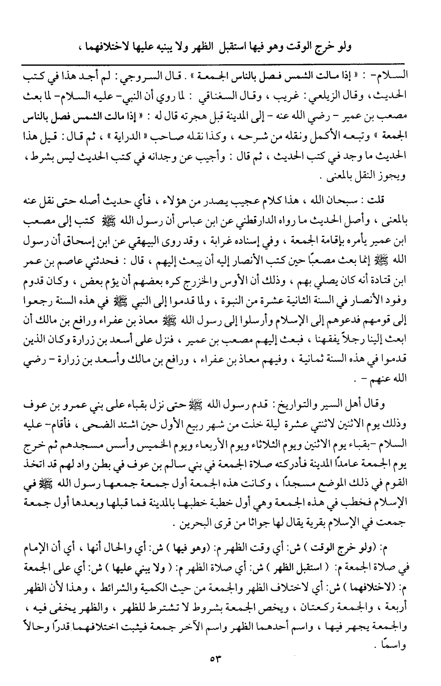 ـــــــــــــــــــــــــــــQالسلام-: «إذا مالت الشمس فصل بالناس الجمعة» . قال السروجي: لم أجد هذا في كتب الحديث، وقال الزيلعي: غريب، وقال السغناقي: لما روي «أن النبي - عَلَيْهِ السَّلَامُ - لما بعث مصعب بن عمير - رَضِيَ اللَّهُ عَنْهُ - إلى المدينة قبل هجرته، قال له: "إذا مالت الشمس فصل بالناس الجمعة» وتبعه الأكمل ونقله من شرحه، وكذا نقله صاحب " الدراية ". ثم قال: قيل: هذا الحديث ما وجد في كتب الحديث، ثم قال: وأجيب عن وجدانه في كتب الحديث ليس بشرط، ويجوز النقل بالمعنى.