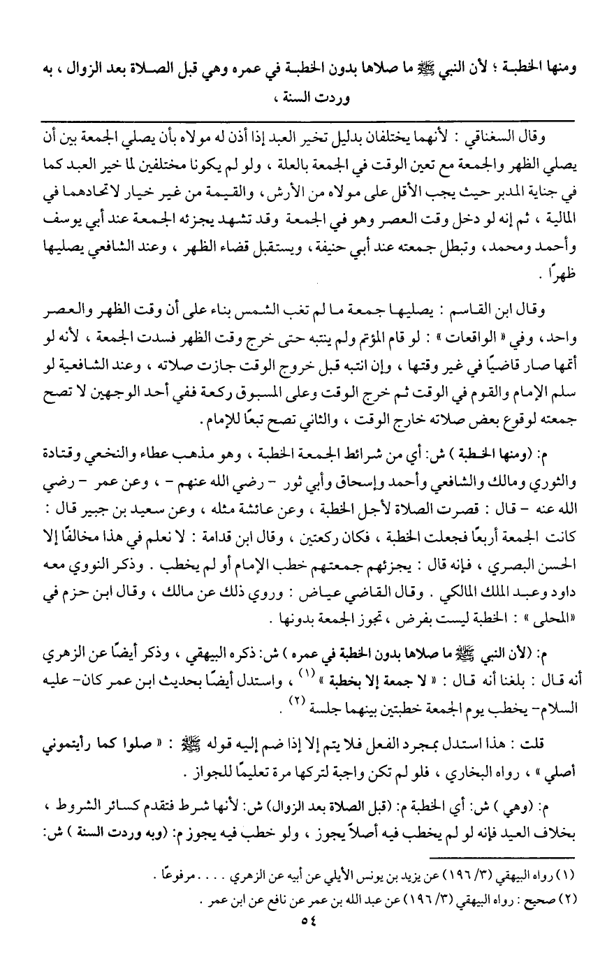 ومنها الخطبة: لأن النبي - صَلَّى اللَّهُ عَلَيْهِ وَسَلَّمَ - ما صلاها بدون الخطبة في عمره وهي قبل الصلاة بعد الزوال، به وردت السنة.