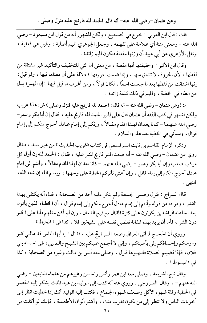 وذكره الإمام القاسم بن ثابت السرقسطي في كتاب " غريب الحديث " من غير سند، فقال: روي عن عثمان - رَضِيَ اللَّهُ عَنْهُ - أنه صعد المنبر فأرتج المنبر عليه، فقال: الحمد لله إن أول كل مركب صعب وإن أبا بكر وعمر - رَضِيَ اللَّهُ عَنْهُمَا - كانا يعدان لهذا المقام مقالا، وأنتم إلى إمام عادل أحوج منكم إلى إمام قائل، وإن أعش تأتكم الخطبة على وجهها، ويعلم الله إن شاء الله، انتهى.