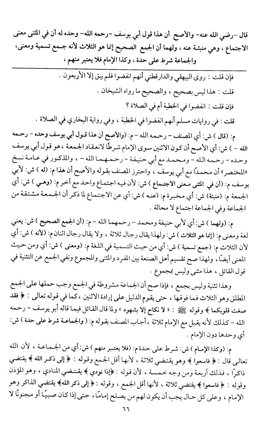 وهذا تثنية وليس بجمع، فإذا صح أن الجماعة مشروطة في الجمع وجب حملها على الجمع المطلق وهو الثلاث فما فوقها، حتى يقوم الدليل على إرادة الاثنين، كما في قَوْله تَعَالَى: {فَقَدْ صَغَتْ قُلُوبُكُمَا} [التحريم: 4] وقوله - صَلَّى اللَّهُ عَلَيْهِ وَسَلَّمَ -: «لا نكاح إلا بشهود» ولما قال القائل فيما قاله أبو يوسف - رَحِمَهُ اللَّهُ - كذلك لأنه يقبل مع الإمام ثلاثة، أجاب المصنف بقوله. م: (والجماعة شرط على حده) ش: أي وحدها دون الإمام.