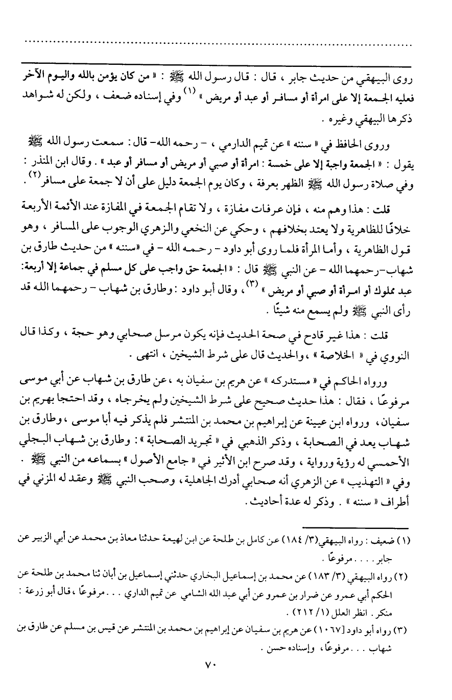 ـــــــــــــــــــــــــــــQروى البيهقي من حديث جابر، قال: قال رسول الله - صَلَّى اللَّهُ عَلَيْهِ وَسَلَّمَ -: «من كان يؤمن بالله واليوم الآخر فعليه الجمعة إلا على امرأة أو مسافر أو عبد أو مريض» وفي إسناده ضعف، ولكن له شواهد ذكرها البيهقي وغيره.