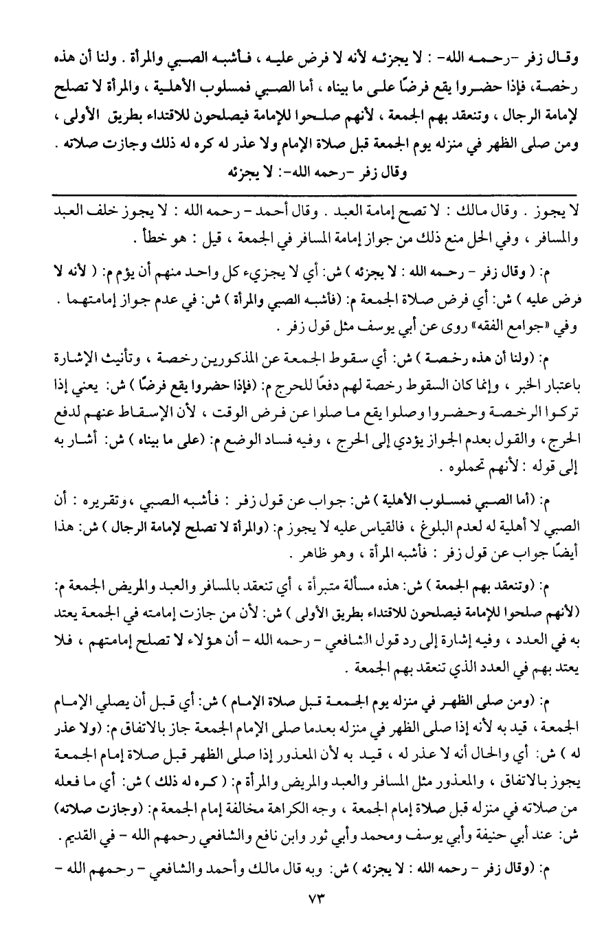 م: (وقال زفر - رَحِمَهُ اللَّهُ -: لا يجزئه) ش: أي لا يجزئ كل واحد منهم أن يؤم. م: (لأنه لا فرض عليه) ش: أي فرض صلاة الجمعة. م: (فأشبه الصبي والمرأة) ش: في عدم جواز إمامتهما. وفي " جوامع الفقه " روى عن أبي يوسف مثل قول زفر.