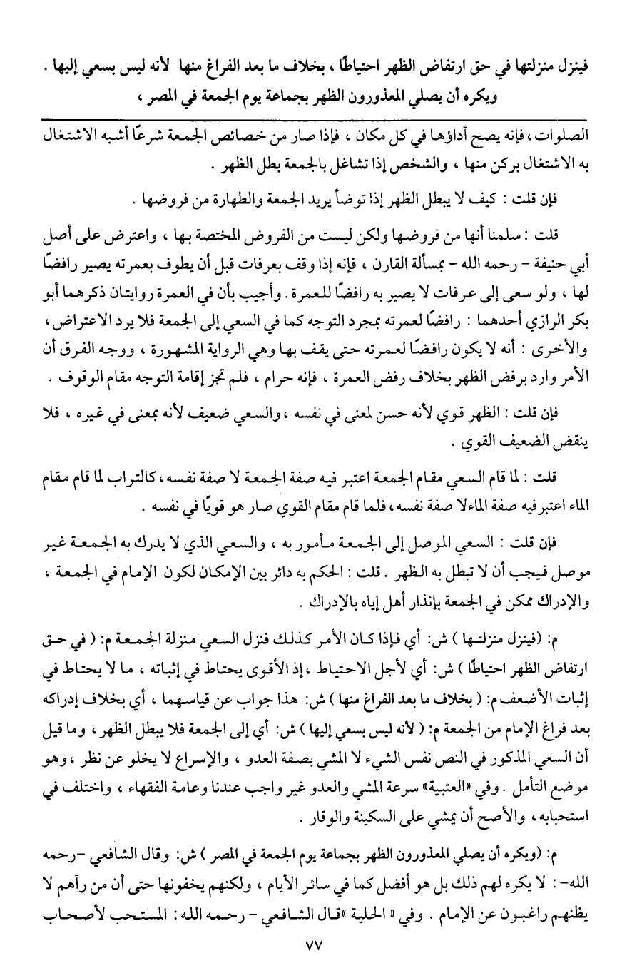 فإن قلت: السعي الموصل إلى الجمعة مأمور به، والسعي الذي لا يدرك به الجمعة غير موصل فيجب أن لا تبطل به الظهر. قلت: الحكم به دائر بين الإمكان لكون الإمام في الجمعة، والإدراك ممكن في الجمعة بإنذار أهل إياه بالإدراك.