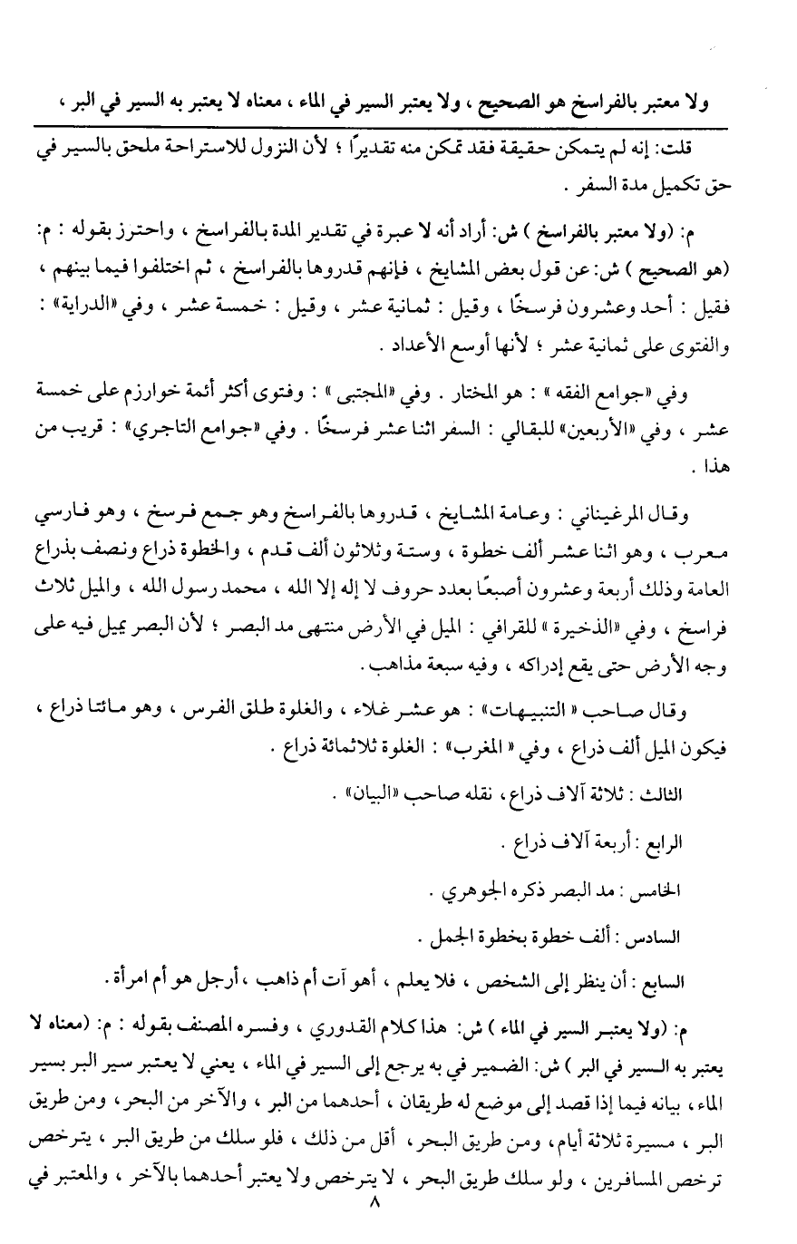 ولا معتبر بالفراسخ هو الصحيح، ولا يعتبر السير في الماء، معناه لا يعتبر به السير في البر،