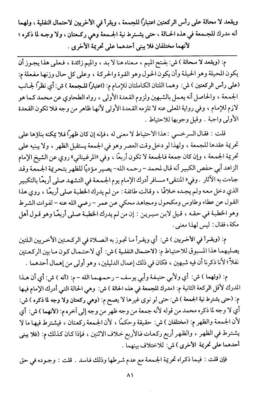 قلت: فقال السرخسي: هذا الاحتياط لا معنى له، فإنه إن كان ظهرا فلا يمكنه بناؤها على تحريمة عقدها للجمعة، ولهذا لو دخل وقت العصر وهو في الجمعة يستقبل الظهر، ولا يبنيه على تحريمة الجمعة، وإن كان جمعة فالجمعة لا تكون أربعا، وفي " المرغيناني " روي عن الشيخ الإمام الزاهد أبي حفص الكبير أنه قال لمحمد - رَحِمَهُ اللَّهُ - يصير مؤديا للظهر بتحريمة الجمعة وقد جاءت به الآثار. وفي " المنتقى " مسافر أدرك الإمام يوم الجمعة في التشهد صلى أربعا بالتكبير الذي دخل معه ولم يجده خلافا، وقالت طائفة: من لم يدرك الخطبة صلى أربعا، روي هذا القول عن عطاء وطاووس ومكحول ومجاهد، محكي عن عمر - رَضِيَ اللَّهُ عَنْهُ - لفوات الشرط وهو الخطبة في حقه، قيل لابن سيرين: إن من لم يدرك الخطبة صلى أربعا وهو قول أهل مكة، فقال: ليس لهذا معنى.