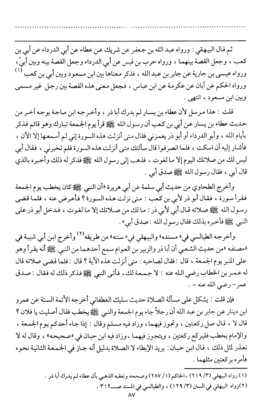 ـــــــــــــــــــــــــــــQثم قال البيهقي: ورواه عبد الله بن جعفر عن شريك عن عطاء عن أبي الدرداء عن أبي بن كعب، وجعل القصة بينهما، ورواه حرب بن قيس عن أبي الدرداء وجعل القصة بينه وبين أبي، ورواه عيسى بن جارية عن جابر بن عبد الله، فذكر معناها بين ابن مسعود وبين أبي بن كعب، ورواه الحكم عن أبان عن عكرمة عن ابن عباس، فجعل معنى هذه القصة بين رجل غير مسمى وبين ابن مسعود، انتهى.