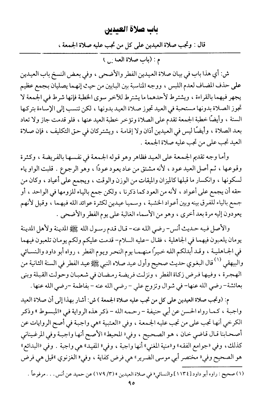 باب صلاة العيدين قال: وتجب صلاة العيدين على كل من تجب عليه صلاة الجمعة،