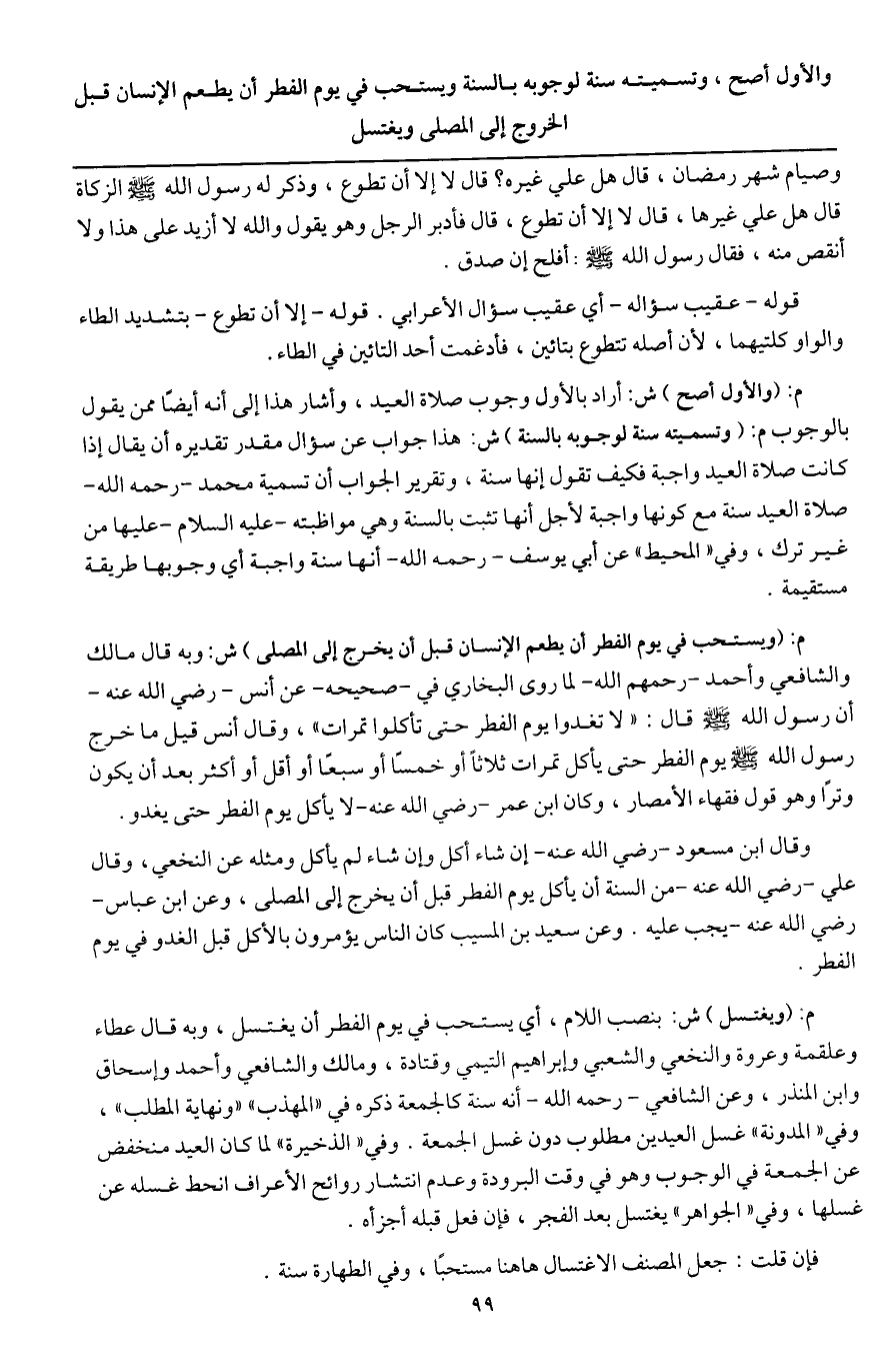 م: (والأول أصح) ش: أراد بالأول وجوب صلاة العيد، وأشار هذا إلى أنه أيضا ممن يقول بالوجوب. م: (وتسميته سنة لوجوبه بالسنة) ش: هذا جواب عن سؤال مقدر تقديره أن يقال إذا كانت صلاة العيد واجبة فكيف تقول إنها سنة، وتقرير الجواب أن تسمية محمد - رَحِمَهُ اللَّهُ - صلاة العيد سنة مع كونها واجبة لأجل أنها تثبت بالسنة وهي مواظبته- عَلَيْهِ السَّلَامُ - عليها من غير ترك، وفي " المحيط " عن أبي يوسف - رَحِمَهُ اللَّهُ - أنها سنة واجبة أي وجوبها طريقة مستقيمة.