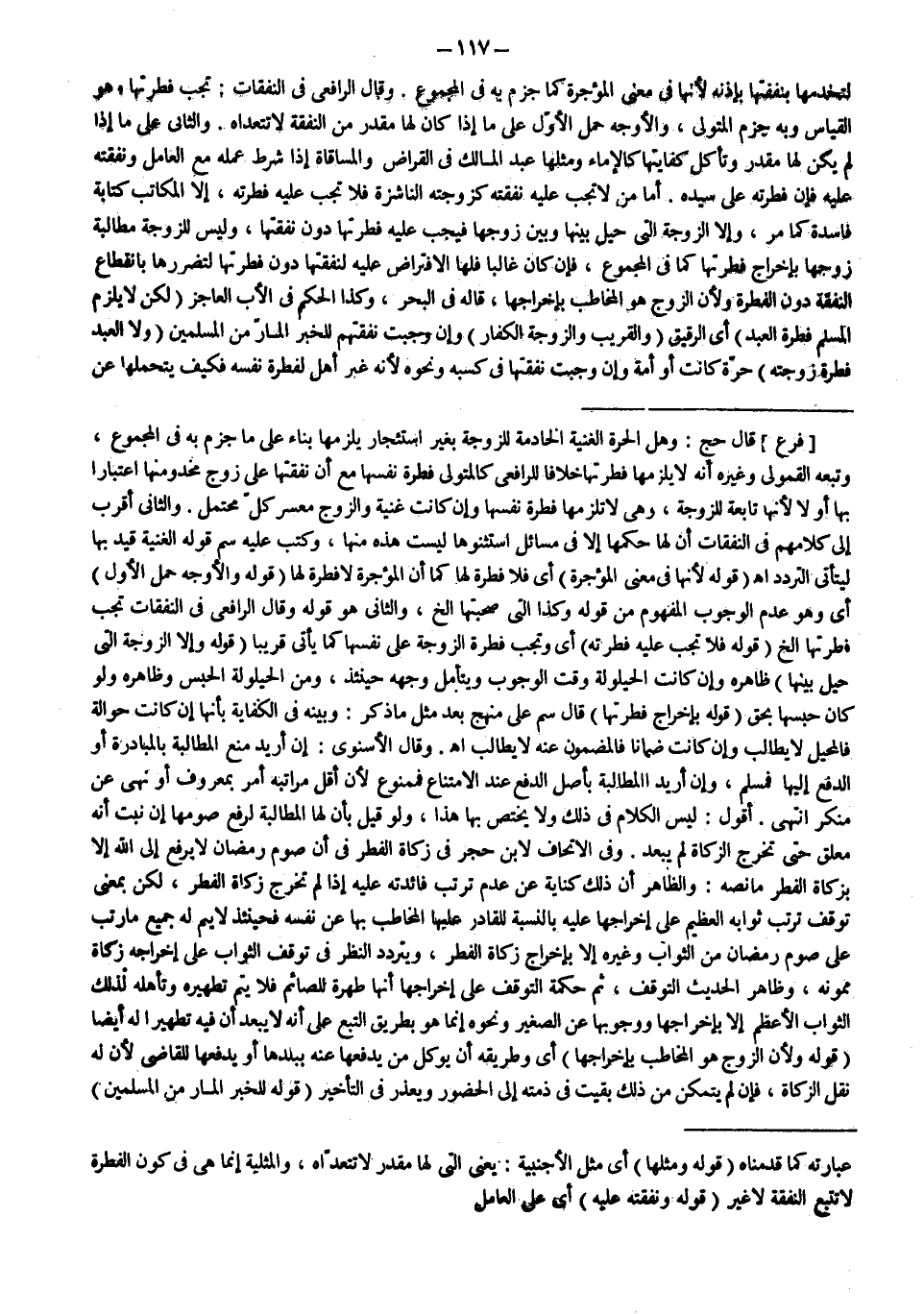 (لَكِنْ) (لَا يَلْزَمُ الْمُسْلِمَ فِطْرَةُ الْعَبْدِ) أَيْ الرَّقِيقِ (وَالْقَرِيبِ وَالزَّوْجَةِ الْكُفَّارِ) وَإِنْ وَجَبَتْ نَفَقَتُهُمْ لِلْخَبَرِ الْمَارِّ مِنْ الْمُسْلِمِينَ (وَلَا الْعَبْدَ فِطْرَةُ زَوْجَتِهِ) حُرَّةً كَانَتْ أَوْ أَمَةً وَإِنْ وَجَبَتْ نَفَقَتُهَا فِي كَسْبِهِ وَنَحْوِهِ لِأَنَّهُ غَيْرُ أَهْلٍ لِفِطْرَةِ نَفْسِهِ فَكَيْفَ يَتَحَمَّلُهَا عَنْ