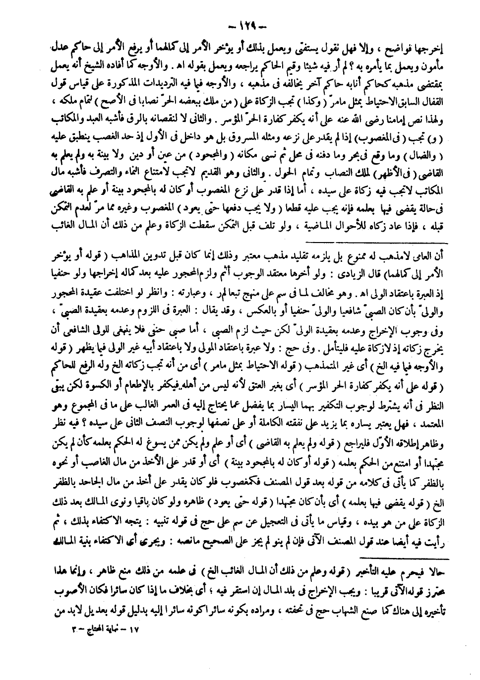 (قَوْلُهُ: أَوْ يُؤَخَّرُ الْأَمْرُ إلَى كَمَالِهِمَا) قَالَ الزِّيَادِيُّ: وَلَوْ أَخَّرَهَا مُعْتَقِدَ الْوُجُوبِ أَثِمَ وَلَزِمَ الْمَحْجُورَ عَلَيْهِ بَعْدَ كَمَالِهِ إخْرَاجُهَا وَلَوْ حَنَفِيًّا إذْ الْعِبْرَةُ بِاعْتِقَادِ الْوَلِيِّ اهـ. وَهُوَ مُخَالِفٌ لِمَا فِي سم عَلَى مَنْهَجٍ تَبَعًا لمر، وَعِبَارَتُهُ: وَانْظُرْ لَوْ اخْتَلَفَتْ عَقِيدَةُ الْمَحْجُورِ وَالْوَلِيِّ بِأَنْ كَانَ الصَّبِيُّ شَافِعِيًّا وَالْوَلِيُّ حَنَفِيًّا أَوْ بِالْعَكْسِ، وَقَدْ يُقَالُ: الْعِبْرَةُ فِي اللُّزُومِ وَعَدَمِهِ بِعَقِيدَةِ الصَّبِيِّ، وَفِي وُجُوبِ الْإِخْرَاجِ وَعَدَمِهِ بِعَقِيدَةِ الْوَلِيِّ لَكِنْ حَيْثُ لَزِمَ الصَّبِيَّ، أَمَّا صَبِيٌّ حَنَفِيٌّ فَلَا يَنْبَغِي لِلْوَلِيِّ الشَّافِعِيِّ أَنْ يُخْرِجَ زَكَاتَهُ إذْ لَا زَكَاةَ عَلَيْهِ فَلْيُتَأَمَّلْ. وَفِي حَجّ: وَلَا عِبْرَةَ بِاعْتِقَادِ الْمَوْلَى وَلَا بِاعْتِقَادِ أَبِيهِ غَيْرِ الْوَلِيِّ فِيمَا يَظْهَرُ (قَوْلُهُ: وَالْأَوْجَهُ فِيمَا فِيهِ إلَخْ) أَيْ غَيْرِ الْمُتَمَذْهِبِ.