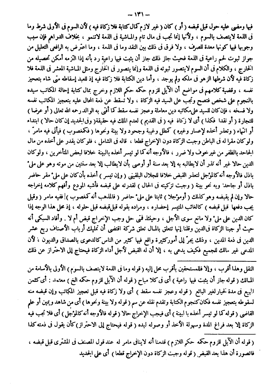 فِيهَا وَمَضَى عَلَيْهِ حَوْلٌ قَبْلَ قَبْضِهِ (أَوْ) كَانَ (غَيْرَ لَازِمٍ كَمَالِ كِتَابَةٍ فَلَا زَكَاةَ فِيهِ) لِأَنَّ السَّوْمَ فِي الْأُولَى شَرْطٌ وَمَا فِي الذِّمَّةِ لَا يَتَّصِفُ بِالسَّوْمِ، وَلِأَنَّهَا إنَّمَا تَجِبُ فِي مَالٍ تَامٍّ وَالْمَاشِيَةُ فِي الذِّمَّةِ لَا تَنْمُو، بِخِلَافِ الدَّرَاهِمِ فَإِنَّ سَبَبَ وُجُوبِهَا فِيهَا كَوْنُهَا مُعَدَّةً لِلصَّرْفِ، وَلَا فَرْقَ فِي ذَلِكَ بَيْنَ النَّقْدِ وَمَا فِي الذِّمَّةِ، وَمَا اعْتَرَضَ بِهِ الرَّافِعِيُّ التَّعْلِيلَ مِنْ جَوَازِ ثُبُوتِ لَحْمِ رَاعِيَةٍ فِي الذِّمَّةِ فَحَيْثُ جَازَ ذَلِكَ جَازَ أَنْ يُثْبِتَ فِيهَا رَاعِيَةً رَدَّ بِأَنَّهُ إذَا الْتَزَمَهُ أَمْكَنَ تَحْصِيلُهُ مِنْ الْخَارِجِ، وَالْكَلَامُ فِي أَنَّ السَّوْمَ لَا يُتَصَوَّرُ ثُبُوتُهُ فِي الذِّمَّةِ وَإِنَّمَا يُتَصَوَّرُ فِي الْخَارِجِ وَمِثْلُ الْمَاشِيَةِ الْمُعَشَّرُ فِي الذِّمَّةِ فَلَا زَكَاةَ فِيهِ لِأَنَّ شَرْطَهَا الزَّهْوُ فِي مِلْكِهِ وَلَمْ يُوجَدْ.