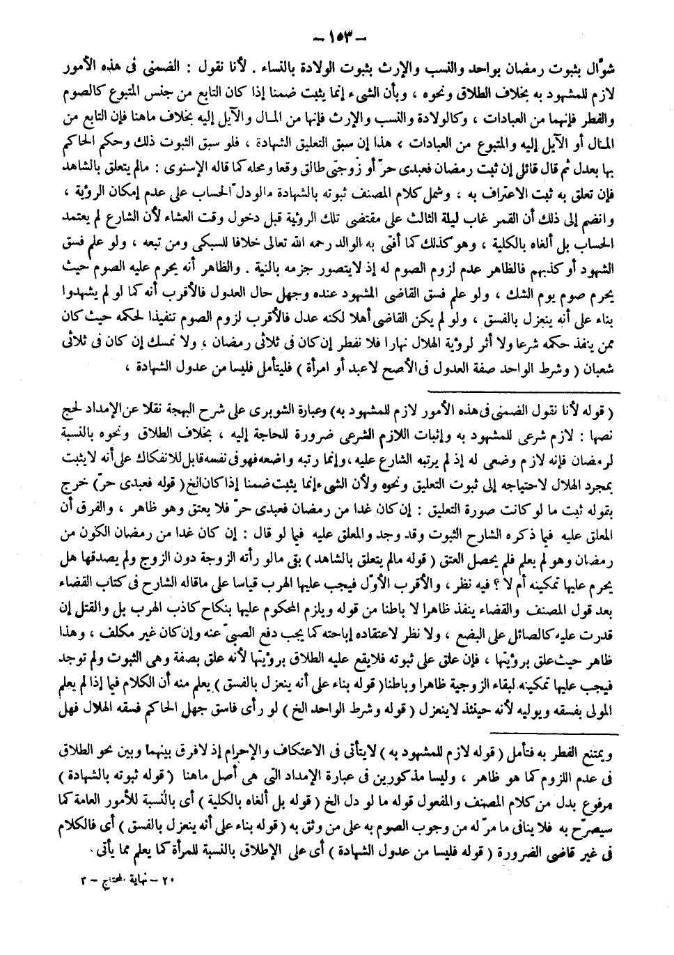 شَوَّالٌ بِثُبُوتِ رَمَضَانَ بِوَاحِدٍ وَالنَّسَبُ وَالْإِرْثُ بِثُبُوتِ الْوِلَادَةِ بِالنِّسَاءِ. لِأَنَّا نَقُولُ: الضِّمْنِيُّ فِي هَذِهِ الْأُمُورِ لَازِمٌ لِلْمَشْهُودِ بِهِ بِخِلَافِ الطَّلَاقِ وَنَحْوِهِ، وَبِأَنَّ الشَّيْءَ إنَّمَا يَثْبُتُ ضِمْنًا إذَا كَانَ التَّابِعُ مِنْ جِنْسِ الْمَتْبُوعِ كَالصَّوْمِ وَالْفِطْرِ فَإِنَّهُمَا مِنْ الْعِبَادَاتِ، وَكَالْوِلَادَةِ وَالنَّسَبِ وَالْإِرْثِ فَإِنَّهَا مِنْ الْمَالِ وَالْآيِلِ إلَيْهِ بِخِلَافِ مَا هُنَا فَإِنَّ التَّابِعَ مِنْ الْمَالِ أَوْ الْآيِلِ إلَيْهِ وَالْمَتْبُوعِ مِنْ الْعِبَادَاتِ، هَذَا إنْ سَبَقَ التَّعْلِيقَ الشَّهَادَةُ، فَلَوْ سَبَقَ الثُّبُوتُ ذَلِكَ وَحَكَمَ الْحَاكِمُ بِهَا بِعَدْلٍ ثُمَّ قَالَ قَائِلٌ: إنْ ثَبَتَ رَمَضَانُ فَعَبْدِي حُرٌّ أَوْ زَوْجَتِي طَالِقٌ وَقَعَا وَمَحِلُّهُ كَمَا قَالَهُ الْإِسْنَوِيُّ: مَا لَمْ يَتَعَلَّقْ بِالشَّاهِدِ فَإِنْ تَعَلَّقَ بِهِ ثَبَتَ الِاعْتِرَافُ بِهِ، وَشَمِلَ كَلَامُ الْمُصَنِّفِ ثُبُوتَهُ بِالشَّهَادَةِ مَا لَوْ دَلَّ الْحِسَابُ عَلَى عَدَمِ إمْكَانِ الرُّؤْيَةِ، وَانْضَمَّ إلَى ذَلِكَ أَنَّ الْقَمَرَ غَابَ لَيْلَةَ الثَّالِثِ عَلَى مُقْتَضَى تِلْكَ الرُّؤْيَةِ قَبْلَ دُخُولِ وَقْتِ الْعِشَاءِ لِأَنَّ الشَّارِعَ لَمْ يَعْتَمِدْ الْحِسَابَ بَلْ أَلْغَاهُ بِالْكُلِّيَّةِ، وَهُوَ كَذَلِكَ كَمَا أَفْتَى بِهِ الْوَالِدُ - رَحِمَهُ اللَّهُ تَعَالَى - خِلَافًا لِلسُّبْكِيِّ وَمَنْ تَبِعَهُ، وَلَوْ عَلِمَ فِسْقَ الشُّهُودِ أَوْ كَذِبَهُمْ فَالظَّاهِرُ عَدَمُ لُزُومِ الصَّوْمِ لَهُ إذْ لَا يُتَصَوَّرُ جَزْمُهُ بِالنِّيَّةِ. وَالظَّاهِرُ أَنَّهُ يَحْرُمُ عَلَيْهِ الصَّوْمُ حَيْثُ يَحْرُمُ صَوْمُ يَوْمِ الشَّكِّ، وَلَوْ عُلِمَ فِسْقُ الْقَاضِي الْمَشْهُودِ عِنْدَهُ وَجُهِلَ حَالُ الْعُدُولِ فَالْأَقْرَبُ أَنَّهُ كَمَا لَوْ لَمْ يَشْهَدُوا بِنَاءً عَلَى أَنَّهُ يَنْعَزِلُ بِالْفِسْقِ، وَلَوْ لَمْ يَكُنْ الْقَاضِي أَهْلًا لَكِنَّهُ عَدْلٌ فَالْأَقْرَبُ لُزُومُ الصَّوْمِ تَنْفِيذًا لِحُكْمِهِ حَيْثُ كَانَ مِمَّنْ يَنْفُذُ حُكْمُهُ شَرْعًا وَلَا أَثَرَ لِرُؤْيَةِ الْهِلَالِ نَهَارًا فَلَا نُفْطِرُ إنْ كَانَ فِي ثَلَاثِينَ رَمَضَانَ، وَلَا نُمْسِكُ إنْ كَانَ فِي ثَلَاثِينَ شَعْبَانَ (وَشَرْطُ الْوَاحِدِ صِفَةُ الْعُدُولِ فِي الْأَصَحِّ لَا عَبْدٌ أَوْ امْرَأَةٌ) فَلْيُتَأَمَّلْ فَلَيْسَا مِنْ عُدُولِ الشَّهَادَةِ،