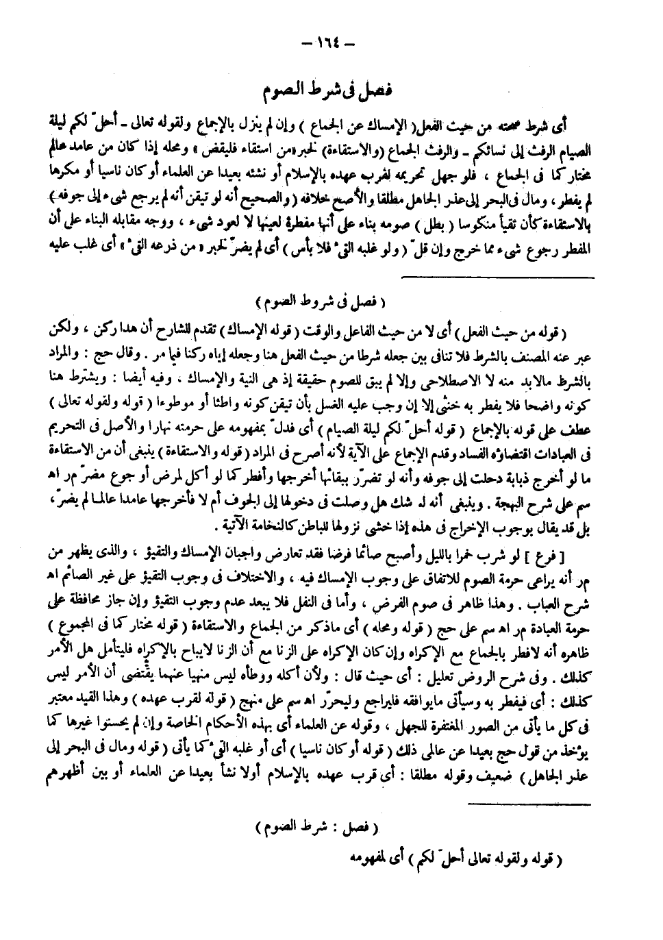 وَقَالَ حَجّ: وَالْمُرَادُ بِالشَّرْطِ مَا لَا بُدَّ مِنْهُ لَا الِاصْطِلَاحِيُّ وَإِلَّا لَمْ يَبْقَ لِلصَّوْمِ حَقِيقَةٌ إذْ هِيَ النِّيَّةُ وَالْإِمْسَاكُ، وَفِيهِ أَيْضًا: وَيُشْتَرَطُ هُنَا كَوْنُهُ وَاضِحًا فَلَا يُفْطِرُ بِهِ خُنْثَى إلَّا إنْ وَجَبَ عَلَيْهِ الْغُسْلُ بِأَنْ تَيَقَّنَ كَوْنَهُ وَاطِئًا أَوْ مَوْطُوءًا (قَوْلُهُ وَلِقَوْلِهِ تَعَالَى) عَطْفٌ عَلَى قَوْلِهِ بِالْإِجْمَاعِ (قَوْلُهُ: {أُحِلَّ لَكُمْ لَيْلَةَ الصِّيَامِ} [البقرة: 187] أَيْ فَدَلَّ بِمَفْهُومِهِ عَلَى حُرْمَتِهِ نَهَارًا وَالْأَصْلُ فِي التَّحْرِيمِ فِي الْعِبَادَاتِ اقْتِضَاؤُهُ الْفَسَادَ وَقَدَّمَ الْإِجْمَاعَ عَلَى الْآيَةِ لِأَنَّهُ أَصْرَحُ فِي الْمُرَادِ (قَوْلُهُ وَالِاسْتِقَاءَةُ) يَنْبَغِي أَنَّ مِنْ الِاسْتِقَاءَةِ مَا لَوْ أَخْرَجَ ذُبَابَةً دَخَلَتْ إلَى جَوْفِهِ وَأَنَّهُ لَوْ تَضَرَّرَ بِبَقَائِهَا أَخْرَجَهَا وَأَفْطَرَ كَمَا لَوْ أَكَلَ لِمَرَضٍ أَوْ جُوعٍ مُضِرٍّ مَرَّ اهـ سم عَلَى شَرْحِ الْبَهْجَةِ.