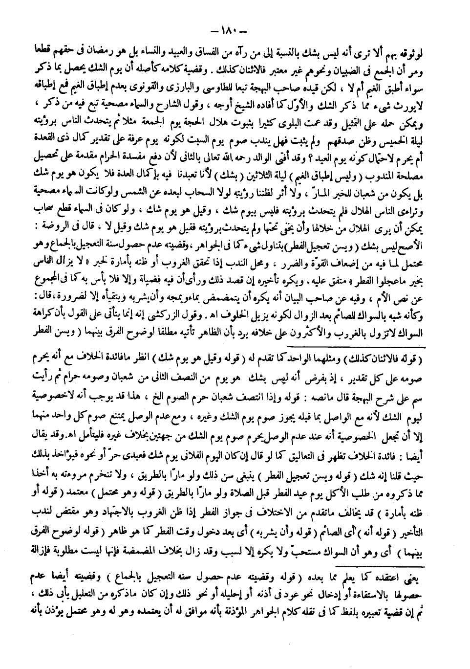 وَقَضِيَّةُ كَلَامِهِ كَأَصْلِهِ أَنَّ يَوْمَ الشَّكِّ يَحْصُلُ بِمَا ذُكِرَ سَوَاءٌ أَطْبَقَ الْغَيْمُ أَمْ لَا، لَكِنْ قَيَّدَهُ صَاحِبُ الْبَهْجَةِ تَبَعًا لِلطَّاوُسِيِّ وَالْبَارِزِيِّ وَالْقُونَوِيِّ بِعَدَمِ إطْبَاقِ الْغَيْمِ فَمَعَ إطْبَاقِهِ لَا يُورِثُ شَيْءٌ مِمَّا ذُكِرَ الشَّكَّ وَالْأَوَّلُ كَمَا أَفَادَهُ الشَّيْخُ أَوْجَهُ، وَقَوْلُ الشَّارِحِ وَالسَّمَاءُ مُصْحِيَةٌ تَبِعَ فِيهِ مَنْ ذُكِرَ، وَيُمْكِنُ حَمْلُهُ عَلَى التَّمْثِيلِ وَقَدْ عَمَّتْ الْبَلْوَى كَثِيرًا بِثُبُوتِ هِلَالِ الْحِجَّةِ يَوْمَ الْجُمُعَةِ مَثَلًا ثُمَّ يَتَحَدَّثُ النَّاسُ بِرُؤْيَتِهِ لَيْلَةَ الْخَمِيسِ وَظُنَّ صِدْقُهُمْ وَلَمْ يَثْبُتْ فَهَلْ يُنْدَبُ صَوْمُ يَوْمِ السَّبْتِ لِكَوْنِهِ يَوْمَ عَرَفَةَ عَلَى تَقْدِيرِ كَمَالِ ذِي الْقَعْدَةِ أَمْ يَحْرُمُ لِاحْتِمَالِ كَوْنِهِ يَوْمَ الْعِيدِ؟ وَقَدْ أَفْتَى الْوَالِدُ - رَحِمَهُ اللَّهُ تَعَالَى - بِالثَّانِي لِأَنَّ دَفْعَ مَفْسَدَةِ الْحَرَامِ مُقَدَّمَةٌ عَلَى تَحْصِيلِ مَصْلَحَةِ الْمَنْدُوبِ (وَلَيْسَ إطْبَاقُ الْغَيْمِ) لَيْلَةَ الثَّلَاثِينَ (بِشَكٍّ) لِأَنَّا تَعَبَّدْنَا فِيهِ بِإِكْمَالِ الْعِدَّةِ فَلَا يَكُونُ هُوَ يَوْمُ شَكٍّ بَلْ يَكُونُ مِنْ شَعْبَانَ لِلْخَبَرِ الْمَارِّ، (وَلَا أَثَرَ لِظَنِّنَا رُؤْيَتَهُ لَوْلَا السَّحَابُ لِبُعْدِهِ عَنْ الشَّمْسِ وَلَوْ كَانَتْ السَّمَاءُ مُصْحِيَةً) وَتَرَاءَى النَّاسُ الْهِلَالَ فَلَمْ يَتَحَدَّثْ بِرُؤْيَتِهِ فَلَيْسَ بِيَوْمِ شَكٍّ، وَقِيلَ هُوَ يَوْمُ شَكٍّ، وَلَوْ كَانَ فِي السَّمَاءِ قِطَعُ سَحَابٍ يُمْكِنُ أَنْ يُرَى الْهِلَالُ مِنْ خِلَالِهَا وَأَنْ يَخْفَى تَحْتَهَا وَلَمْ يَتَحَدَّثْ بِرُؤْيَتِهِ فَقِيلَ هُوَ يَوْمُ شَكٍّ وَقِيلَ لَا، قَالَ فِي الرَّوْضَةِ: الْأَصَحُّ لَيْسَ بِشَكٍّ