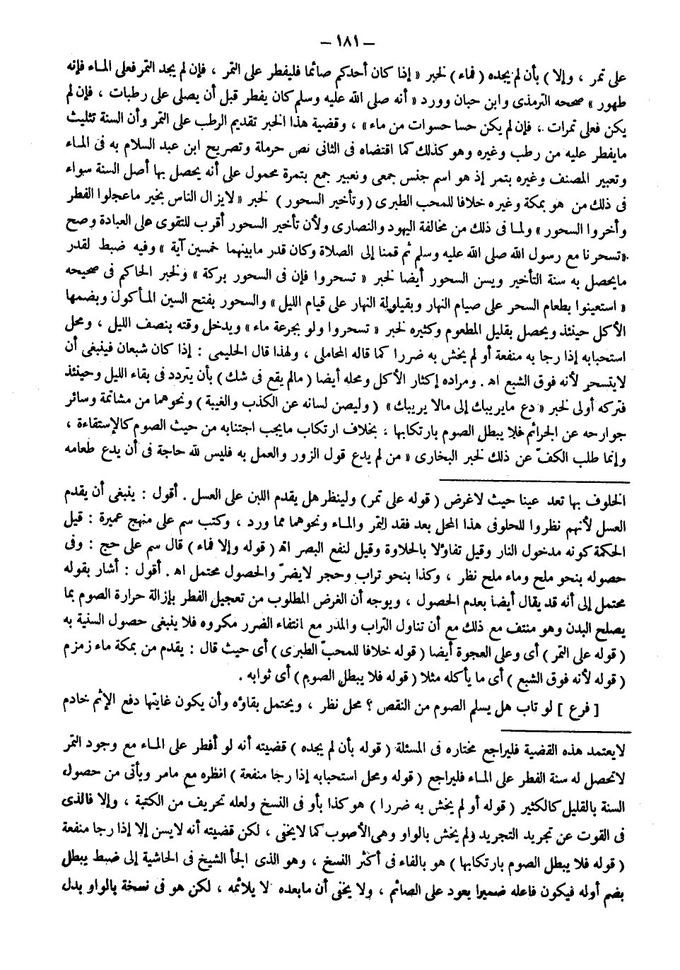 بِأَنْ لَمْ يَجِدْهُ (فَمَاءٌ) لِخَبَرِ «إذَا كَانَ أَحَدُكُمْ صَائِمًا فَلْيُفْطِرْ عَلَى التَّمْرِ، فَإِنْ لَمْ يَجِدْ التَّمْرَ فَعَلَى الْمَاءِ فَإِنَّهُ طَهُورٌ» صَحَّحَهُ التِّرْمِذِيُّ وَابْنُ حِبَّانَ وَوَرَدَ «أَنَّهُ - صَلَّى اللَّهُ عَلَيْهِ وَسَلَّمَ - كَانَ يُفْطِرُ قَبْلَ أَنْ يُصَلِّيَ عَلَى رُطَبَاتٍ، فَإِنْ لَمْ يَكُنْ فَعَلَى تَمَرَاتٍ، فَإِنْ لَمْ يَكُنْ حَسَا حُسْوَاتٍ مِنْ مَاءٍ» ، وَقَضِيَّةُ هَذَا الْخَبَرِ تَقْدِيمُ الرُّطَبِ عَلَى التَّمْرِ وَأَنَّ السُّنَّةَ تَثْلِيثُ مَا يُفْطِرُ عَلَيْهِ مِنْ رُطَبٍ وَغَيْرِهِ وَهُوَ كَذَلِكَ كَمَا اقْتَضَاهُ فِي الثَّانِي نَصُّ حَرْمَلَةَ وَتَصْرِيحُ ابْنِ عَبْدِ السَّلَامِ بِهِ فِي الْمَاءِ وَتَعْبِيرُ الْمُصَنِّفِ وَغَيْرِهِ بِتَمْرٍ إذْ هُوَ اسْمُ جِنْسٍ جَمْعِيٍّ وَتَعْبِيرُ جَمْعٍ بِتَمْرِهِ مَحْمُولٌ عَلَى أَنَّهُ يَحْصُلُ بِهَا أَصْلُ السُّنَّةِ سَوَاءٌ فِي ذَلِكَ مَنْ هُوَ بِمَكَّةَ وَغَيْرُهُ خِلَافًا لِلْمُحِبِّ الطَّبَرِيِّ (وَتَأْخِيرُ السُّحُورِ) لِخَبَرِ «لَا يَزَالُ النَّاسُ بِخَيْرٍ مَا عَجَّلُوا الْفِطْرَ وَأَخَّرُوا السَّحُورَ» وَلِمَا فِي ذَلِكَ مِنْ مُخَالَفَةِ الْيَهُودِ وَالنَّصَارَى وَلِأَنَّ تَأْخِيرَ السُّحُورِ أَقْرَبُ لِلتَّقْوَى عَلَى الْعِبَادَةِ وَصَحَّ «تَسَحَّرْنَا مَعَ رَسُولِ اللَّهِ - صَلَّى اللَّهُ عَلَيْهِ وَسَلَّمَ - ثُمَّ قُمْنَا إلَى الصَّلَاةِ وَكَانَ قَدْرُ مَا بَيْنَهُمَا خَمْسِينَ آيَةً» وَفِيهِ ضَبْطٌ لِقَدْرِ مَا يَحْصُلُ بِهِ سُنَّةُ التَّأْخِيرِ وَيُسَنُّ السَّحُورُ أَيْضًا لِخَبَرِ «تَسَحَّرُوا فَإِنَّ فِي السَّحُورِ بَرَكَةً» وَلِخَبَرِ الْحَاكِمِ فِي صَحِيحِهِ «اسْتَعِينُوا بِطَعَامِ السَّحَرِ عَلَى صِيَامِ النَّهَارِ وَبِقَيْلُولَةِ النَّهَارِ عَلَى قِيَامِ اللَّيْلِ» وَالسَّحُورُ بِفَتْحِ السِّينِ الْمَأْكُولُ وَبِضَمِّهَا الْأَكْلُ حِينَئِذٍ وَيَحْصُلُ بِقَلِيلِ الْمَطْعُومِ وَكَثِيرِهِ لِخَبَرِ «تَسَحَّرُوا وَلَوْ بِجَرْعَةِ مَاءٍ» وَيَدْخُلُ وَقْتُهُ بِنِصْفِ اللَّيْلِ، وَمَحَلُّ اسْتِحْبَابِهِ إذَا رَجَا بِهِ مَنْفَعَةً أَوْ لَمْ يَخْشَ بِهِ ضَرَرًا كَمَا قَالَهُ الْمَحَامِلِيُّ، وَلِهَذَا قَالَ الْحَلِيمِيُّ: إذَا كَانَ شَبْعَانَ فَيَنْبَغِي أَنْ لَا يَتَسَحَّرَ لِأَنَّهُ فَوْقَ الشِّبَعِ اهـ.
