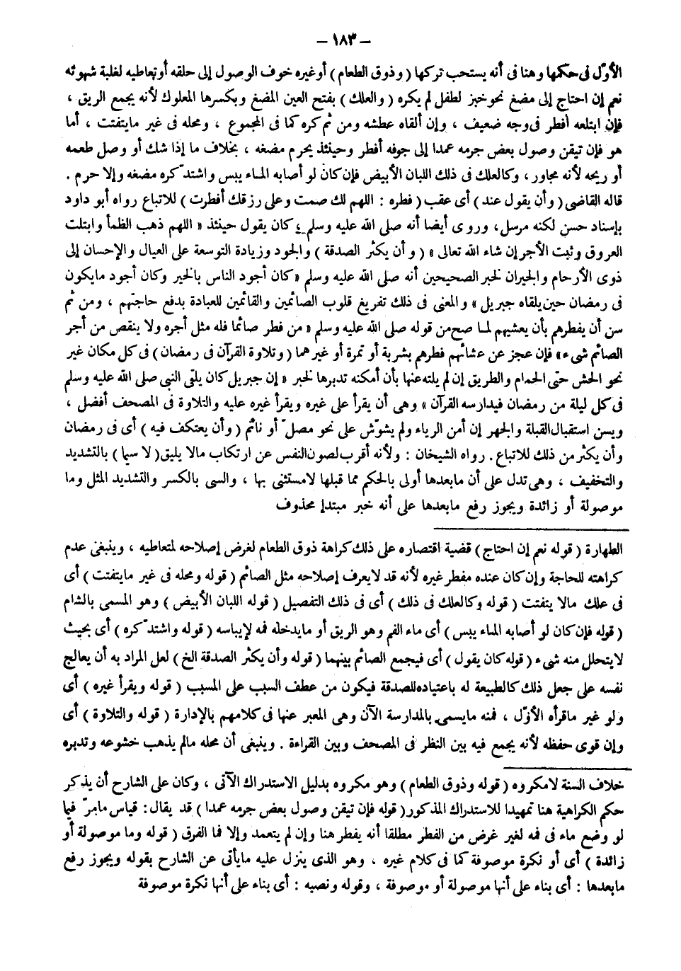 ـــــــــــــــــــــــــــــSالطَّهَارَةُ (قَوْلُهُ: نَعَمْ إنْ احْتَاجَ) قَضِيَّةُ اقْتِصَارِهِ عَلَى ذَلِكَ كَرَاهَةُ ذَوْقِ الطَّعَامِ لِغَرَضِ إصْلَاحِهِ لِمُتَعَاطِيهِ، وَيَنْبَغِي عَدَمُ كَرَاهَتِهِ لِلْحَاجَةِ وَإِنْ كَانَ عِنْدَهُ مُفْطِرٌ غَيْرَهُ لِأَنَّهُ قَدْ لَا يَعْرِفُ إصْلَاحَهُ مِثْلُ الصَّائِمِ (قَوْلُهُ: وَمَحَلُّهُ فِي غَيْرِ مَا يَتَفَتَّتُ) أَيْ فِي عِلْكِ مَا لَا يَتَفَتَّتُ (قَوْلُهُ وَكَالْعِلْكِ ذَلِكَ) أَيْ فِي ذَلِكَ التَّفْصِيلِ (قَوْلُهُ اللِّبَانُ الْأَبْيَضُ) وَهُوَ الْمُسَمَّى بِالشَّامِ (قَوْلُهُ فَإِنْ كَانَ لَوْ أَصَابَهُ الْمَاءُ يَبِسَ) أَيْ مَاءُ الْفَمِ وَهُوَ الرِّيقُ أَوْ مَا يُدْخِلُهُ فَمَه لِإِيبَاسِهِ (قَوْلُهُ: وَاشْتَدَّ كُرْهُ) أَيْ بِحَيْثُ لَا يَتَحَلَّلُ مِنْهُ شَيْءٌ