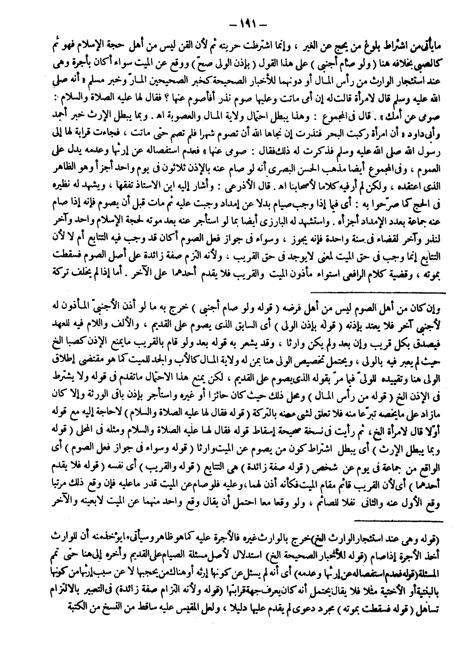 ـــــــــــــــــــــــــــــSوَإِنْ كَانَ مِنْ أَهْلِ الصَّوْمِ لَيْسَ مِنْ أَهْلِ فَرْضِهِ (قَوْلُهُ: وَلَوْ صَامَ أَجْنَبِيٌّ) خَرَجَ بِهِ مَا لَوْ أَذِنَ الْأَجْنَبِيُّ الْمَأْذُونُ لَهُ لِأَجْنَبِيٍّ آخَرَ فَلَا يُعْتَدُّ بِإِذْنِهِ (قَوْلُهُ: بِإِذْنِ الْوَلِيِّ) أَيْ السَّابِقِ الَّذِي يَصُومُ عَلَى الْقَدِيمِ، وَالْأَلِفُ وَاللَّامُ فِيهِ لِلْعَهْدِ فَيَصْدُقُ بِكُلِّ قَرِيبٍ وَإِنْ بَعُدَ وَلَمْ يَكُنْ وَارِثًا، وَقَدْ يُشْعِرُ بِهِ قَوْلُهُ بَعُدَ وَلَوْ قَامَ بِالْقَرِيبِ مَا يَمْنَعُ الْإِذْنَ كَصِبَا إلَخْ حَيْثُ لَمْ يُعَبِّرْ فِيهِ بِالْوَلِيِّ، وَيُحْتَمَلُ تَخْصِيصُ الْوَلِيِّ هُنَا بِمَنْ لَهُ وِلَايَةُ الْمَالِ كَالْأَبِ وَالْجَدِّ لِلْمَيِّتِ كَمَا هُوَ مُقْتَضَى إطْلَاقِ الْوَلِيِّ هُنَا وَتَقْيِيدُهُ لِلْوَلِيِّ فِيمَا مَرَّ بِقَوْلِهِ الَّذِي يَصُومُ عَلَى الْقَدِيمِ، لَكِنْ يَمْنَعُ هَذَا الِاحْتِمَالُ مَا تَقَدَّمَ فِي قَوْلِهِ وَلَا يُشْتَرَطُ فِي الْإِذْنِ إلَخْ (قَوْلُهُ: مِنْ رَأْسِ الْمَالِ) وَمَحَلُّ ذَلِكَ حَيْثُ كَانَ جَائِزًا أَوْ غَيْرَهُ وَاسْتَأْجَرَ بِإِذْنِ بَاقِي الْوَرَثَةِ وَإِلَّا كَانَ مَا زَادَ عَلَى مَا يَخُصُّهُ تَبَرُّعًا مِنْهُ فَلَا تَعَلُّقَ لِشَيْءٍ مِنْهُ بِالتَّرِكَةِ (قَوْلُهُ: فَقَالَ لَهَا - عَلَيْهِ الصَّلَاةُ وَالسَّلَامُ -) لَا حَاجَةَ إلَيْهِ مَعَ قَوْلِهِ أَوَّلًا قَالَ لِامْرَأَةٍ إلَخْ، ثُمَّ رَأَيْت فِي نُسْخَةٍ صَحِيحَةٍ إسْقَاطَ قَوْلِهِ فَقَالَ لَهَا - عَلَيْهِ الصَّلَاةُ وَالسَّلَامُ - وَمِثْلُهُ فِي الْمَحَلِّيِّ (قَوْلُهُ: وَبِمَا يُبْطِلُ الْإِرْثَ) أَيْ يُبْطِلُ اشْتِرَاطَ كَوْنِ مَنْ يَصُومُ عَنْ الْمَيِّتِ وَارِثًا (قَوْلُهُ: وَسَوَاءٌ فِي جَوَازِ فِعْلِ الصَّوْمِ) أَيْ الْوَاقِعِ مِنْ جَمَاعَةٍ فِي يَوْمٍ عَنْ شَخْصٍ (قَوْلُهُ: صِفَةٍ زَائِدَةٍ) هِيَ التَّتَابُعُ (قَوْلُهُ: وَالْقَرِيبِ) أَيْ نَفْسِهِ (قَوْلُهُ: فَلَا يُقَدَّمُ أَحَدُهُمَا) أَيْ لِأَنَّ الْقَرِيبَ قَائِمٌ مَقَامَ الْمَيِّتِ فَكَأَنَّهُ أَذِنَ لَهُمَا، وَعَلَيْهِ فَلَوْ صَامَ عَنْ الْمَيِّتِ قَدْرَ مَا عَلَيْهِ فَإِنْ وَقَعَ ذَلِكَ مُرَتَّبًا وَقَعَ الْأَوَّلُ عَنْهُ وَالثَّانِي نَفْلًا لِلصَّائِمِ، وَلَوْ وَقَعَا مَعًا احْتَمَلَ أَنْ يُقَالَ وَقَعَ وَاحِدٌ مِنْهُمَا عَنْ الْمَيِّتِ لَا بِعَيْنِهِ وَالْآخَرُ